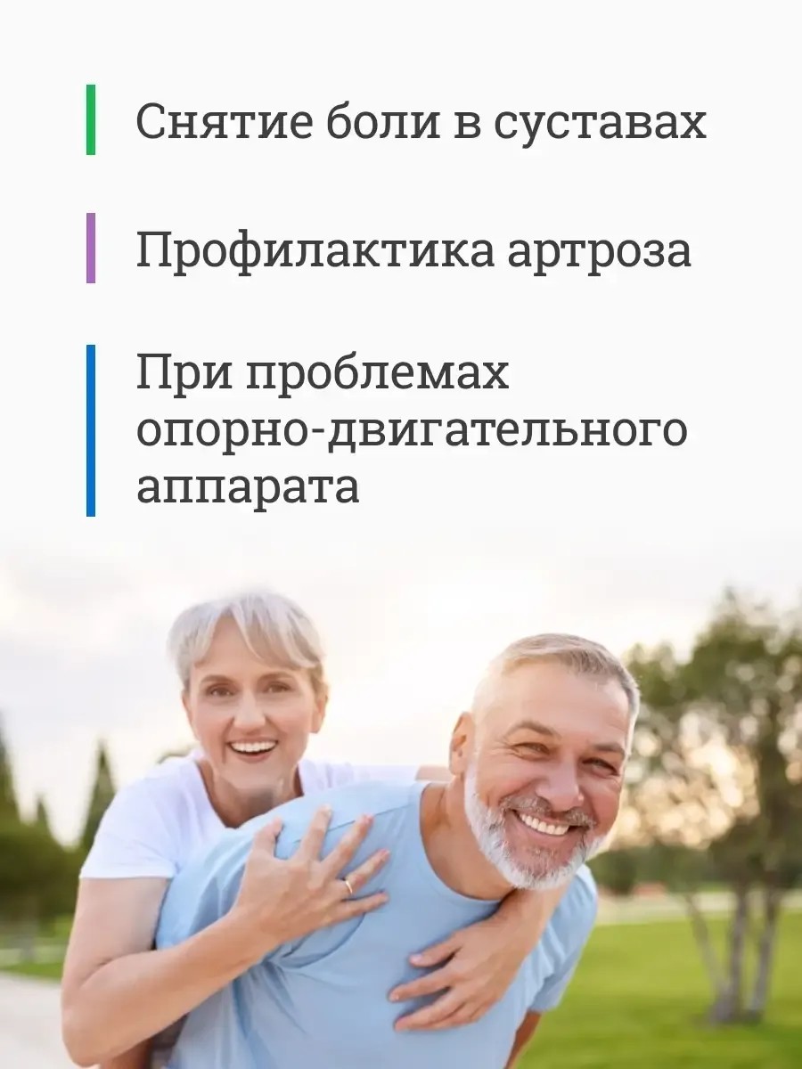 Глюкозамин и хондроитин являются важнейшими хондропротекторами - веществами, отвечающими за защиту, восстановление и здоровое состояние суставного хряща. Снимает боль в суставах. Глюкозамин активно участвует в формировании соединительной ткани хрящей, связок, сухожилий, синовиальной (суставной) жидкости. Хондроитин сохраняет воду в толще хряща, создаёт хорошую амортизацию и поглощает удары, что в итоге повышает прочность соединительной ткани. Способствует регенерации хрящевой ткани. Уменьшает болезненность в пораженных суставах. Оказывает противовоспалительное воздействие. Дарит легкость и комфорт движения. Способ применения: Наносить гель 2-3 раза в день на кожу на проблемные места и втирать в течение 2–3 минут до полного впитывания.