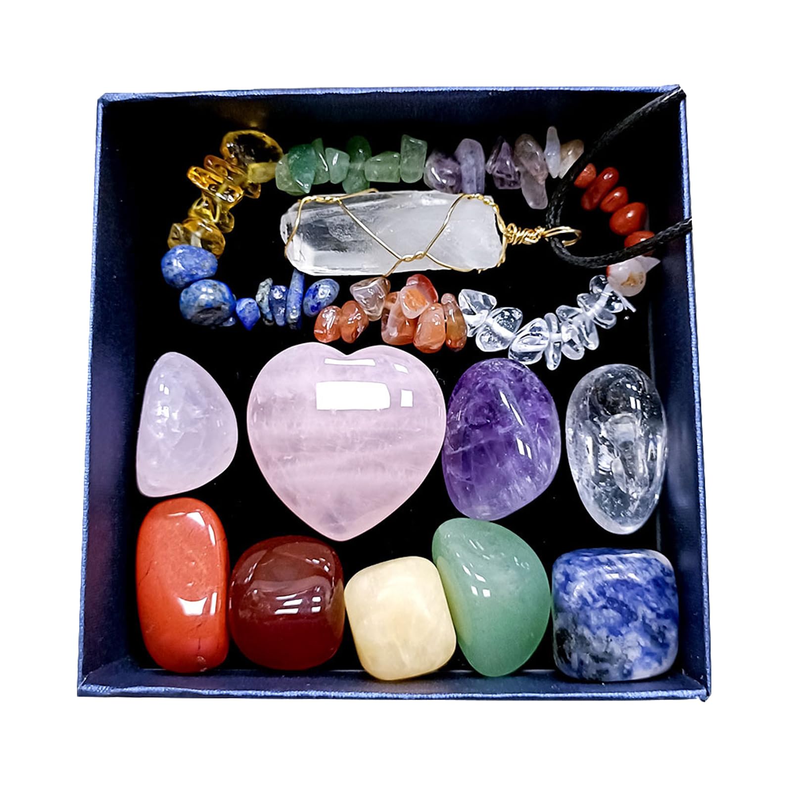 Natural 7 Chakra Colorful Crushed Stone Bracelet White Crystal Pendant and 9Pcs Thumbed Stones Kit Reiki Healing Crystals Jewelry Features: Protects, Heals and Harmonizes - Featuring an array of healing stones and crystals, this gem crystal kit is a natural gateway for inviting harmony and healing to your life. Add color and variety to your existing crystal collections A Stone For Every Need - A wonderful addition to your spiritual practise, crystal grid or altar, this crystal kit includes 8 pieces of tumbled chakra stones including Amethyst, Clear Quartz, Rose Quartz, Tiger Eye, Green Aventurine, Sodalite, Red Agate, Red Jasper; one chakra Rose Quartz Heart Stone and one angel pendant. Don't look any further for a set of protection crystals and stones that will last you a lifetime. Also an ideal gift for anyone who enjoys Reiki, Healing, Wiccan practices or meditation Rose Quartz Heart Stone: Rose Quartz is also known as "Love Stone". It brings unconditional love, gentle tolerance and patience. It is a kind of popular crystal gemstones for women. Best suited for health, wealth, progress, prosperity, family bonding, long lasting relationship Crystal Specifications: Item Name: Chakra Stones Kit Materials: Natural crystals Stone Size: Approx 15-25mm Heart Stone: 30mm Pendant: Approx 16*62mm Package Contents: 8 * Chakra Polished Stones 1 * Rose Quartz Heart 1 * Wire-wrap White Crystal Pendant 1 * Storage Box 1 * instruction Card Suitable for the Person: ?1.It is suitable for the person who have the habits of long-term meditation. ?2.It is suitable for the person who always feel tired on body or spiritual level. ?3.It is suitable for the person who couldn't keep the energy balance and couldn't get inner peace and harmony.?Crystal Gifts?: This Meditation Accessories kit will help you get in touch with your metaphysical energies. Give someone you care about the chance to discover the powerful vibrations of earth precious crystals.Great for crystal collector, beginners,birthstone collecting, housewarming gift,Halloween gift, Christmas gift.Perfect gift for for healing beginners, yoga lover, crystal gemstone collector. ?Natural Crystals?: The healing crystal sets are natural quartz crystal and stone,connecting with the chakra to raise vibration and emit positive energy, make a good impact on physical and mental.Great for balancing the chakras during reiki therapy, meditation, yoga, reiki, spiritual practices,making crystal grids. ?Wide Usage?: Energy stones Perfect for meditation,wire wrapping,artwork,chakra,work,crafting,Cutting,Lapidary,Polishing,Grids,home or office decor.Place this chakra stone set at your office desk, living room,bedroom,and around meditating place to experience the flow of Energies. ?Pocket Stone?: Place chakra stones on chakra points on your body or carry them in your pocket to keep energy flowing freely,which could eliminate all bad energies, evil forces, and negative emotions then you could reach the state of awakening and enlightenment. ?Healing Crystals Kit?: Our gemstones set includes a set of irregular 7 chakra stones, a white crystal pendant, a string of 7 chakra bracelets, a love pink crystal,a sotrage box,a velvet bag and a instruction card.The Charka Healing Crystal kit for you to immediately get the most from you healing crystal and balance your chakras.the best combination ever!.