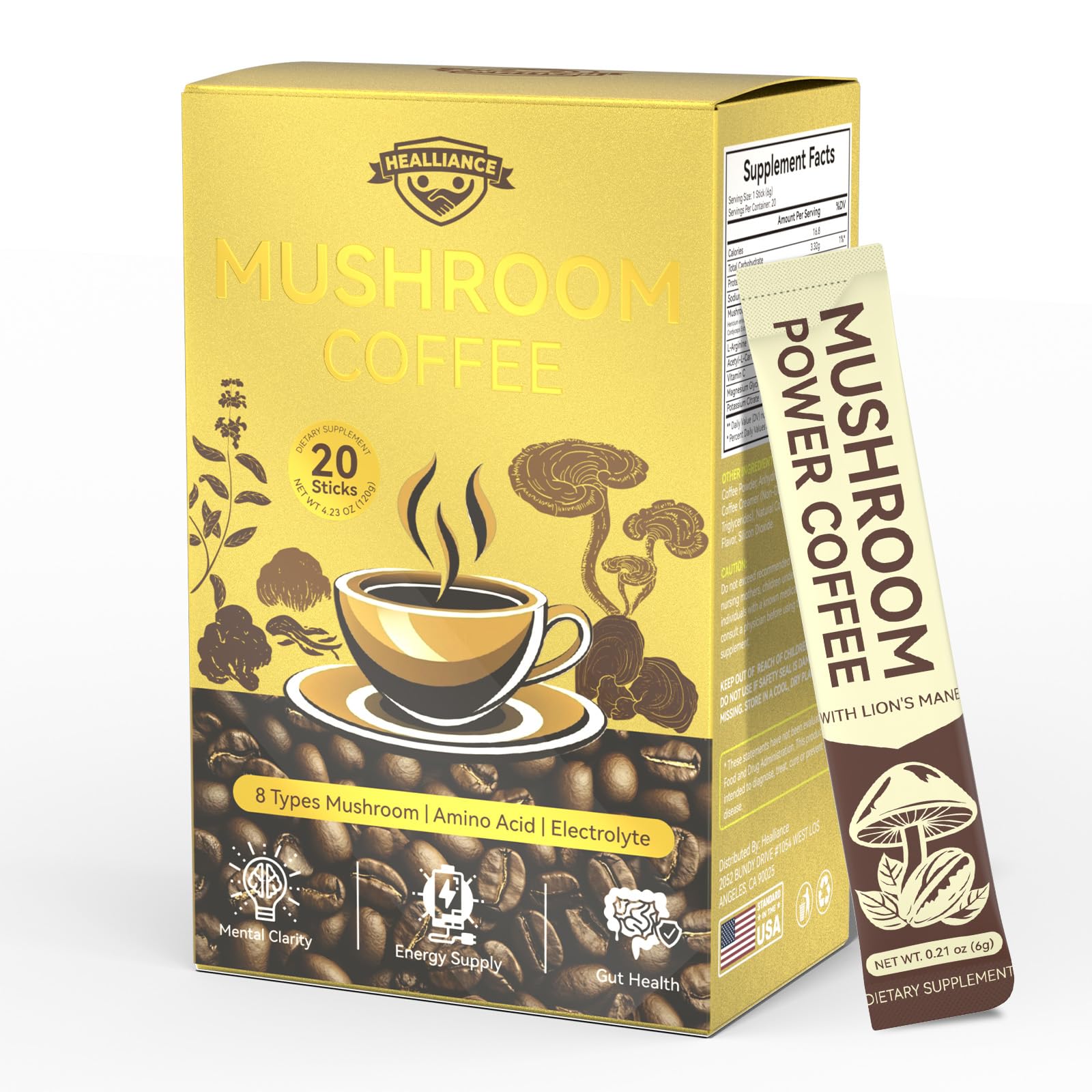 Healliance Instant Mushroom Coffee Single Serve Sticks - with Lion s Mane Cordyceps for Sustained Energy and Focus plus Reishi for Digestive Wellness and a Smooth Non-Bitter Taste (20 Servings)