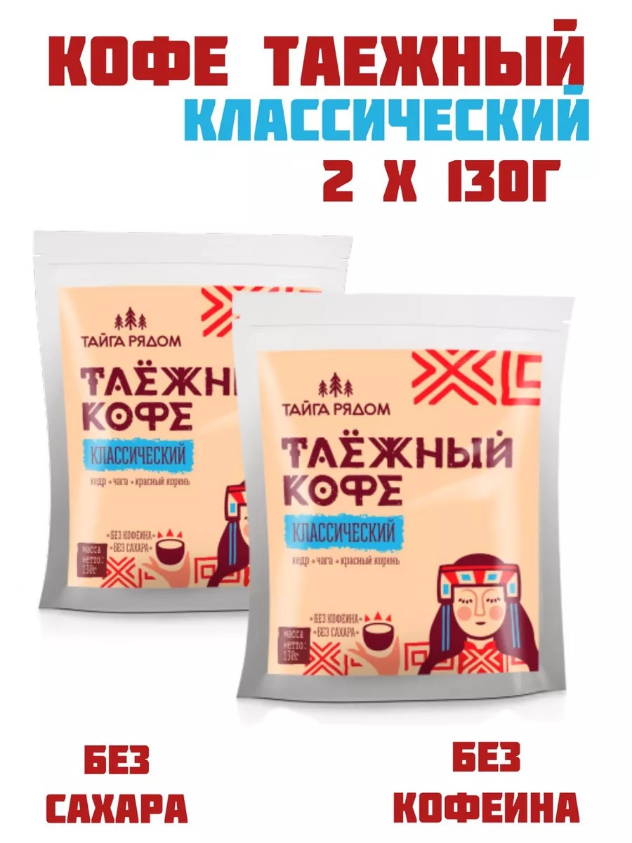 Taiga Coffee "Classic" "Taiga Nearby" Classic 130g. Has a bright, tart cedar flavor, perfectly invigorates and warms. Cedar extract promotes: strengthening the immune system, a beneficial effect on the nervous system, and faster recovery. Red root promotes: increased tone and vitality, a positive effect on the female and male body, and powerful antioxidant activity. Chaga promotes: strengthening the body's defenses, accelerating metabolism, and cleansing the body of waste and toxins. Chicory promotes: improved digestion, strengthening the cardiovascular system, and reducing fatigue and tiredness.