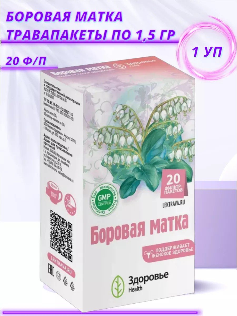 Боровая матка 1,5 20 шт. фильтр-пакеты/здоровье - это биологически активная добавка к пище для женщин Широко применяется как в народной, так и официальной медицине, особенно для лечения гинекологических заболеваний. Трава боровой матки обладает противовоспалительным действием и способствует нормализации функций мочеполовой системы женщин, повышению эффективности антибактериальной терапии, снижению количества повторных обострений. Антисептическое и противовоспалительное действие травы боровой матки обусловлено гидрохиноном, освобождающимся в организме при гидролизе арбутина под действием ферментов и кислот. Для применения 1 фильтр-пакет залить 1 стаканом (200 мл) кипятка, настаивать 15 минут, отжать, довести объем до 200 мл. Принимать взрослым по 1/2 стакана (100 мл) настоя 2 раза в день во время еды.