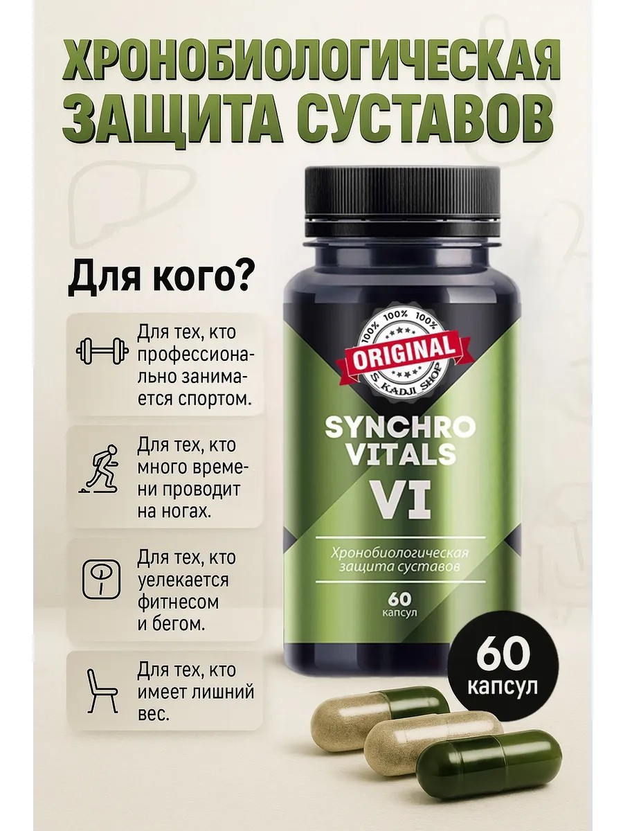 Активные компоненты двухфазного комплекса «Синхровитал VI» обеспечивают защиту суставов от изнашивания и истирания, а также способствуют быстрому восстановлению хрящевой ткани. Формула с глюкозамином, хондроитином и экстрактами сибирских растений действует направленно в соответствие с биоритмами восстановления и активности организма, что повышает защитный эффект.