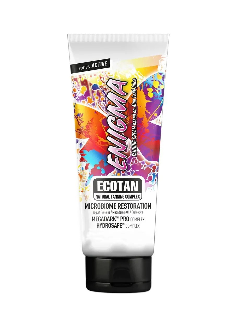 ENIGMA, a professional tanning cream with prebiotics and a natural complex, provides a beautiful, natural tan, moisturizes, and restores the skin for a comfortable and even tan. This cream is based on aloe vera juice and the legendary duo. This gentle natural complex includes rare moringa oil, which stimulates tyrosine production in the skin, as well as walnut oil and carrot extract, which activate melanin production and accelerate tanning. Natural bronzers are streak-free and ensure stable skin darkening, locking in long-lasting results. An innovative moisturizing and protective system based on soothing panthenol, a biosaccharide complex, and modified urea provides intense and deep hydration while maintaining the skin's natural moisture balance. This cream contains prebiotics, hydrolyzed yogurt proteins, and light macadamia oil. It stabilizes the skin's microbiome, maintains its hydrolipid balance, improves elasticity, and smooths the skin's microrelief. It perfectly nourishes and softens, and is ideal for sensitive and dry skin. It's perfect for the first stages of tanning, as well as for post-tanning care for skin prone to sensitivity and flaking. The cream has an exclusive, weightless consistency and a delicate, sensual scent with notes of white peach.