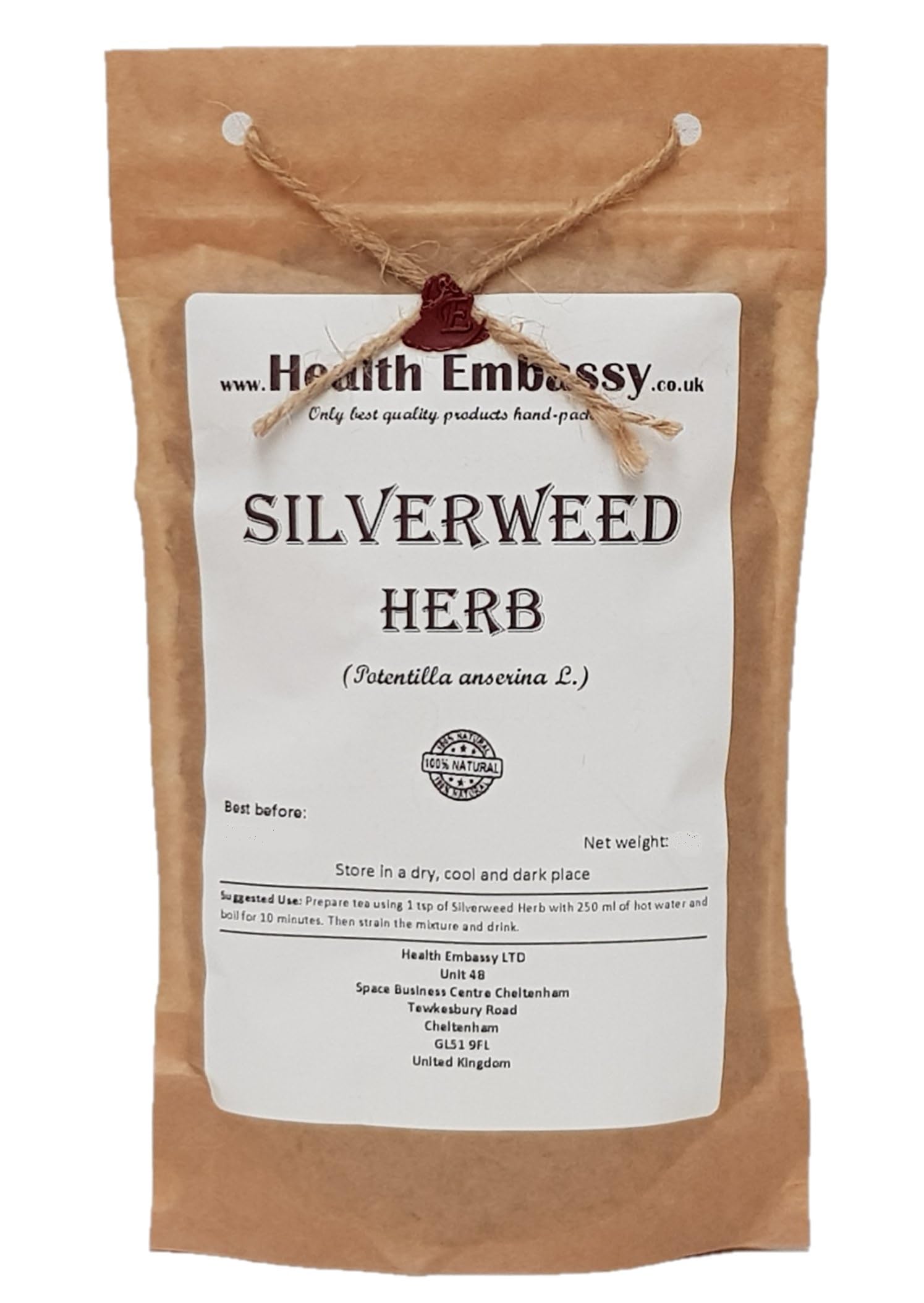 Health Embassy Silverweed Herbal Tea is ideal for gently revitalizing infusions, soothing decoctions, or other culinary uses. Immerse yourself in natural goodness with our carefully selected silverweed. Explore the richness of this exceptional herb and discover a unique experience that harmonizes with your overall well-being. INGREDIENTS Silverweed
