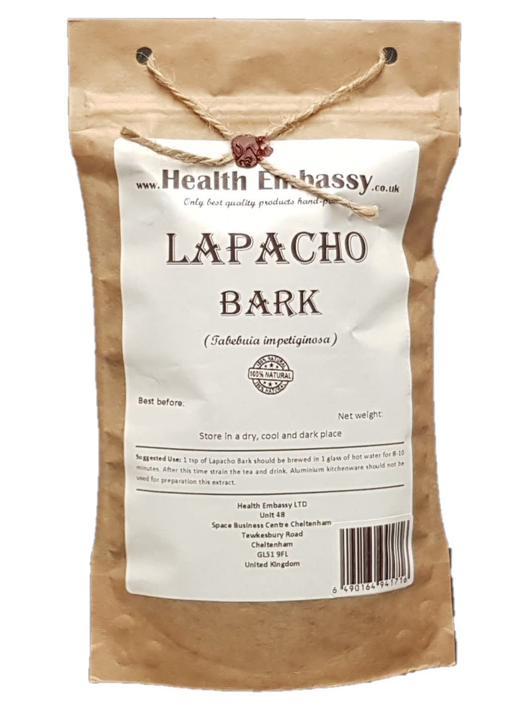 Health Embassy Lapacho Bark is a carefully hand-packaged herbal product, ideal for those seeking a simple and natural ingredient. GMO-free and additive-free, it makes a valuable addition to your herbal tea collection. INGREDIENTS Lapacho Bark