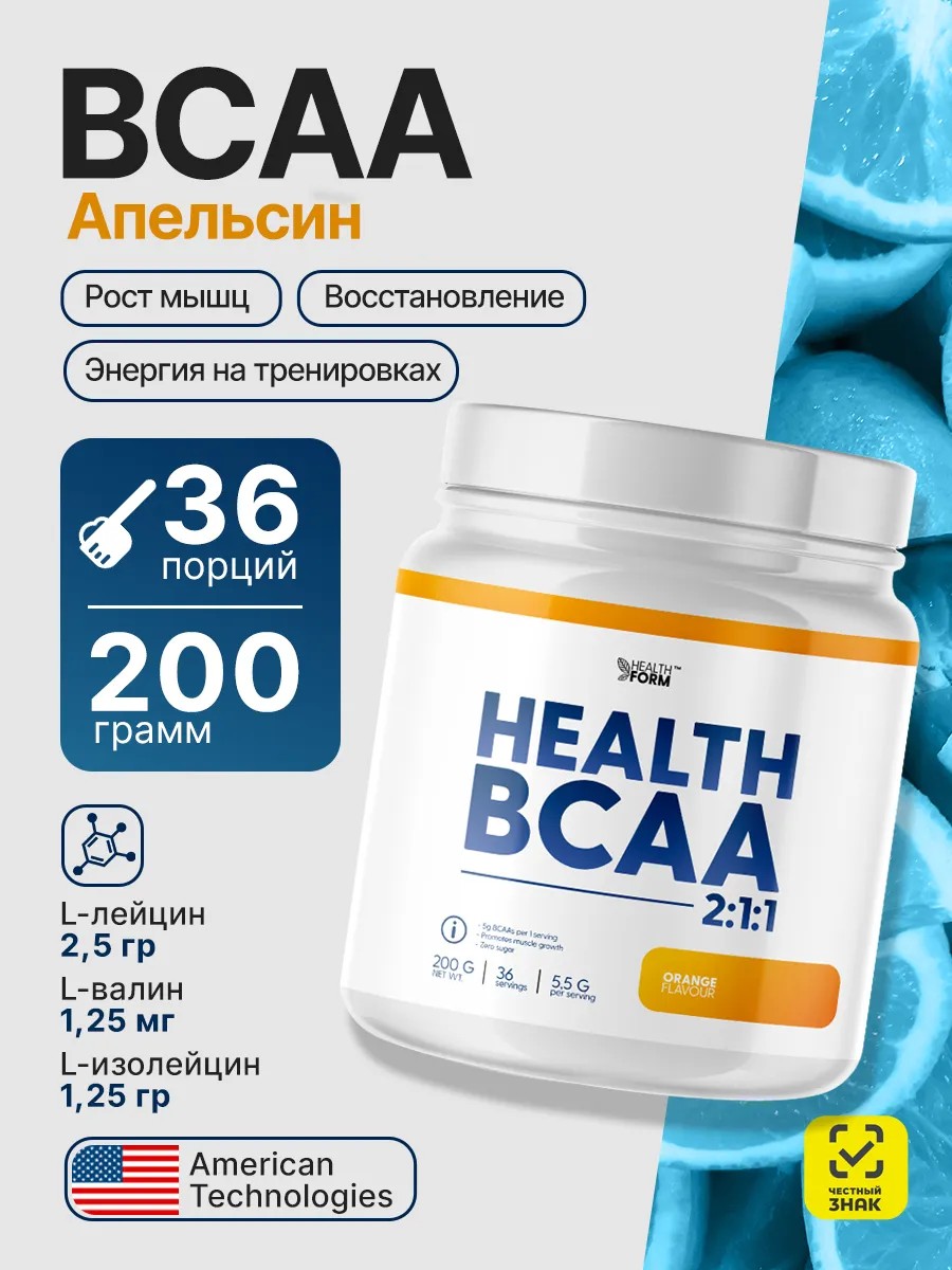 | Комплектация | 1 банка BCAA порошок 200 г со вкусом Апельсин, Health Form BCAA |