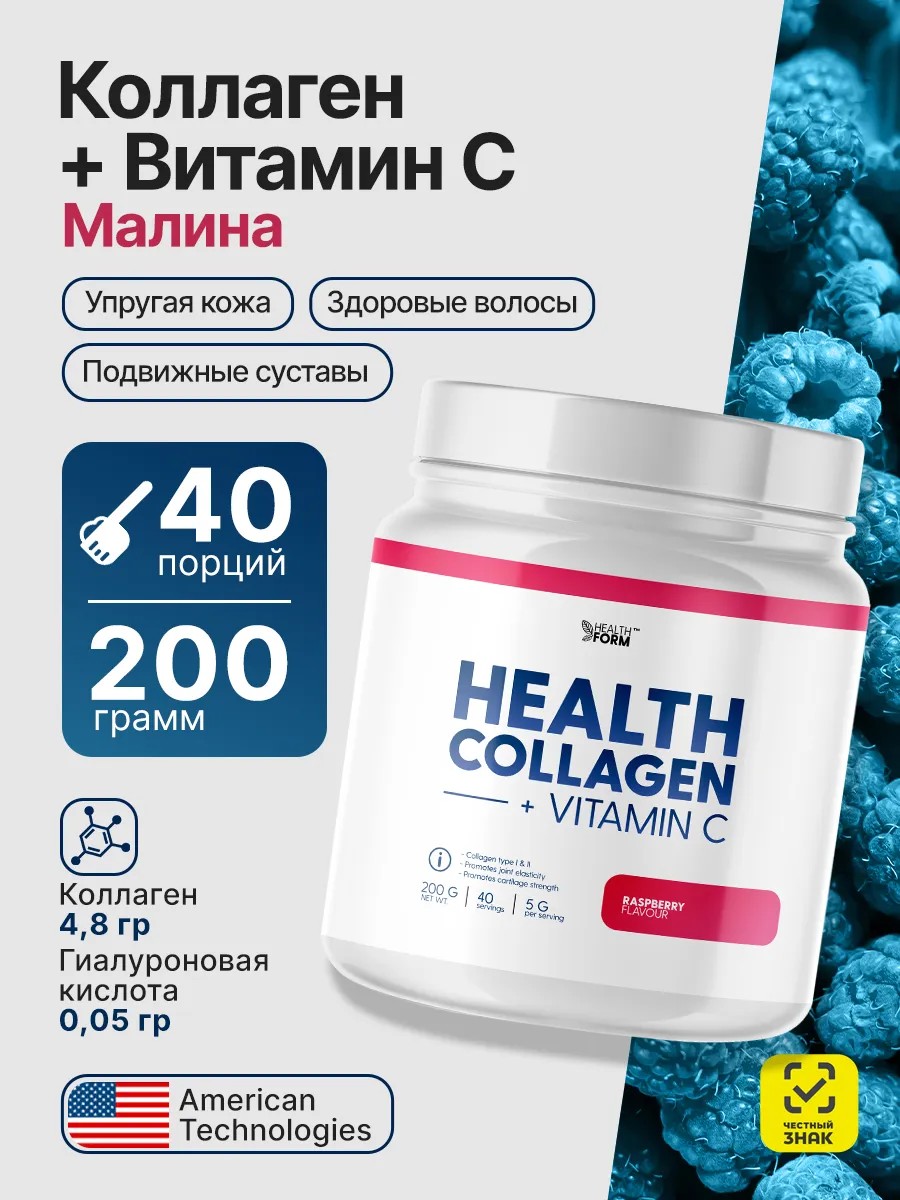 | Комплектация | 1 банка Коллаген + Витамин С 200 гр со вкусом Малина, Health Form Pure Collagen Powder |