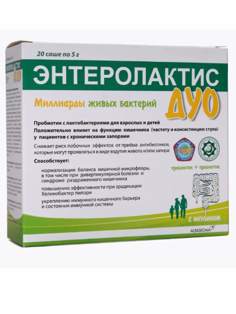 Энтеролактис Дуо саше - пробиотический препарат для восстановления микрофлоры кишечника и улучшения пищеварения. Содержит полезные бактерии, которые укрепляют иммунитет, улучшают работу ЖКТ и помогают справиться с дисбактериозом. Энтеролактис дуо - это биологически активная добавка (БАД) к пище, продукт, содержащий наиболее полезные микроорганизмы, которые помогут восстановить и поддерживать микрофлору кишечника в здоровом состоянии. Пробиотик с лактобактериями для взрослых и детей. Энтеролактис дуо особенно показан в качестве вспомогательного средства для нормализации баланса нарушенной кишечной микрофлоры и стимуляции перистальтики кишечника, например, у пациентов с хроническими запорами, или вследствие дисбактериоза от приема антибактериальных препаратов, который обычно проявляется в виде вздутия живота и/или запора. Продукт безопасен для применения как взрослыми, так и детьми, и является эффективным средством для поддержки здоровья кишечника.