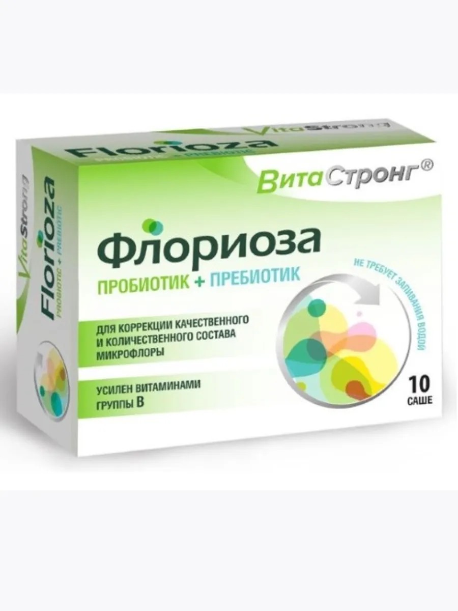 Флориоза ВИТАСТРОНГ пор саше - пробиотический порошок для восстановления микрофлоры кишечника и укрепления иммунитета. Содержит полезные бактерии, которые улучшают пищеварение и повышают устойчивость к инфекциям. Флориоза ВитаСтронг – это биологически активная добавка (БАД) к пище, которая содержит пробиотики, пребиотик и витамины группы В. Применяется для того, чтобы не допустить дисбаланса микрофлоры кишечника и последующего сбоя иммунитета во время антибиотикотерапии или сразу после нее, а также при хронических заболеваниях ЖКТ. Еще одной областью ее применения является профилактика кишечных расстройств во время путешествий и во время вспышки кишечных инфекций.