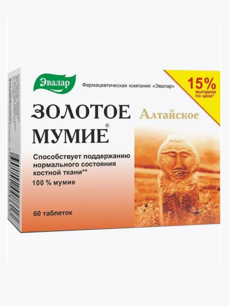 Мумие Золотое Алтайское очищ табл - очищенное мумие из Алтая, богатое минералами и биологически активными веществами. Укрепляет иммунитет, улучшает пищеварение и поддерживает общее здоровье. Мумие - древнее, но до настоящего времени таящее немало загадок, вещество природного происхождения. Это горькая на вкус твердая масса со специфическим острым запахом, темно-коричневого или черного цвета с блестящей поверхностью. При нагревании мумие размягчается, в воде растворяется с образованием мутного раствора.