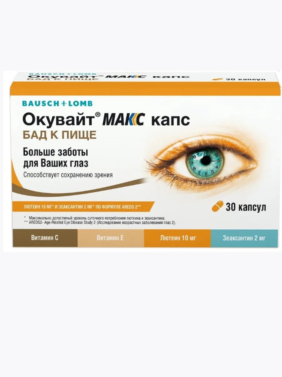 Окувайт Макс капс - комплекс для поддержки зрения, содержащий лютеин, зеаксантин и витамины. Защищает глаза от возрастных изменений и уменьшает усталость при повышенных зрительных нагрузках. Компоненты «Окувайт МАКС капс» не вырабатываются организмом и рекомендованы для включения в ежедневный рацион питания. Содержащиеся в составе продукта каротиноиды способствуют защите сетчатки от разрушающего воздействия яркого света, снижают риск возникновения и развития возрастных дегенеративных изменений сетчатки и обладают антиоксидантными свойствами.
