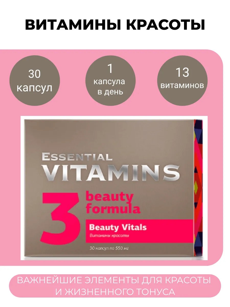 Витаминно-минеральный комплекс Essential Beauty Vitals содержит 13 витаминов, таурин и коэнзим Q10. Его активная формула помогает сохранить отличное самочувствие, защитить организм от преждевременного старения, поддержать красоту кожи и волос.