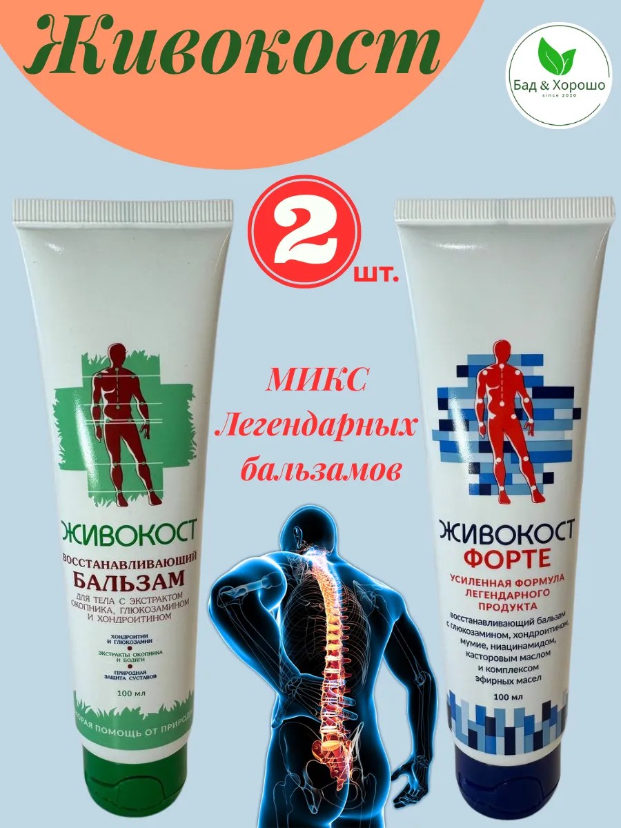 Легендарные бальзамы из самого сердца Сибири. Живокост форте синий и Живокост восстанавливающий с экстрактом окопника, глюкозамином и хондроитином. Бальзамы является дополнительным средством в комплексной терапии для суставов и костно-мышечной системы. Новая усиленная формула с глюкозамином, хондроитином, мумие, витамином PP и касторовым маслом. помогает улучшить подвижность. Действует быстрее, чем классическая формула. Имеет натуральный состав. Мы рекомендуем использовать бальзамы: