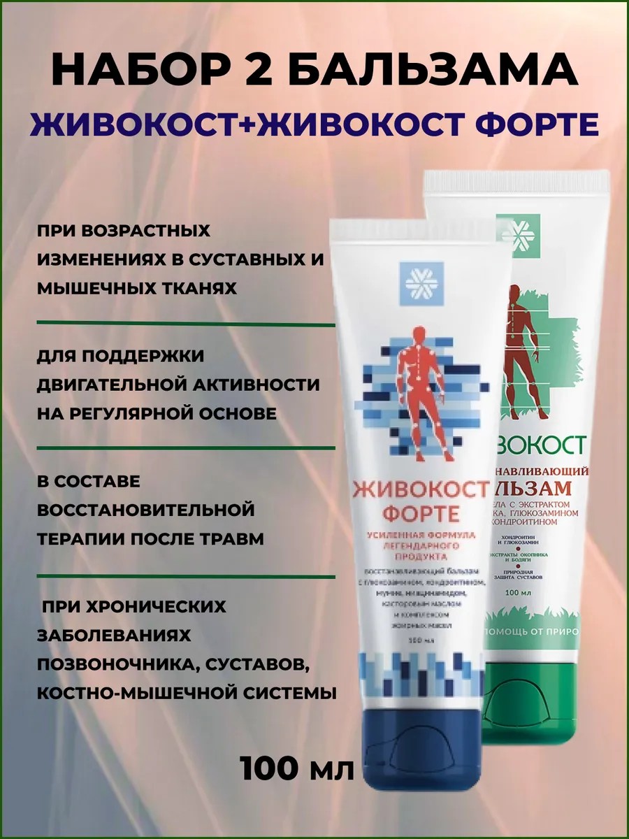 Набор из двух Крем-бальзамов - Живокост и Живокост Форте усиленный- надежное и быстрое решение для профилактики, против воспалений в суставах, скованности движений. Мазь от боли в суставах и мышцах содержит в себе: глюкозамин, хондроитин, мумие, витамины PP и касторовые масла. Коллаген для улучшения подвижности является дополнительным средством в комплексной терапии для суставов и костно-мышечной системы.