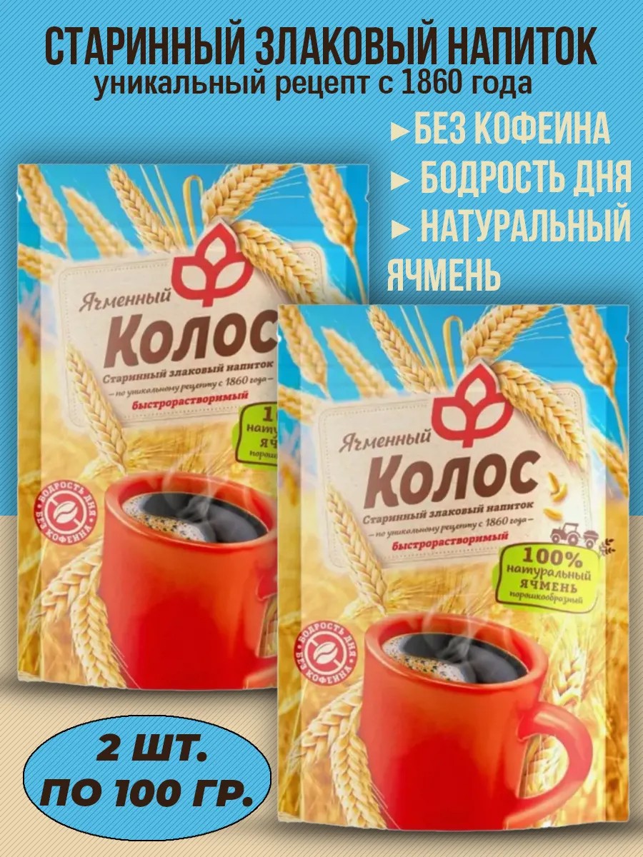 Старинный злаковый порошкообразный напиток Ячменный колос приготовлен из отборных зерен ячменя. Он удачно сочетает в себе насыщенный кофейный вкус напитка и полезные свойства натуральных обжаренных злаков. Колос ячменный нормализует работу нервной системы, обладает успокаивающим действием, восстанавливает баланс микрофлоры, восстанавливает силы, не повышает артериальное давление, без кофеина, быстрорастворимый.