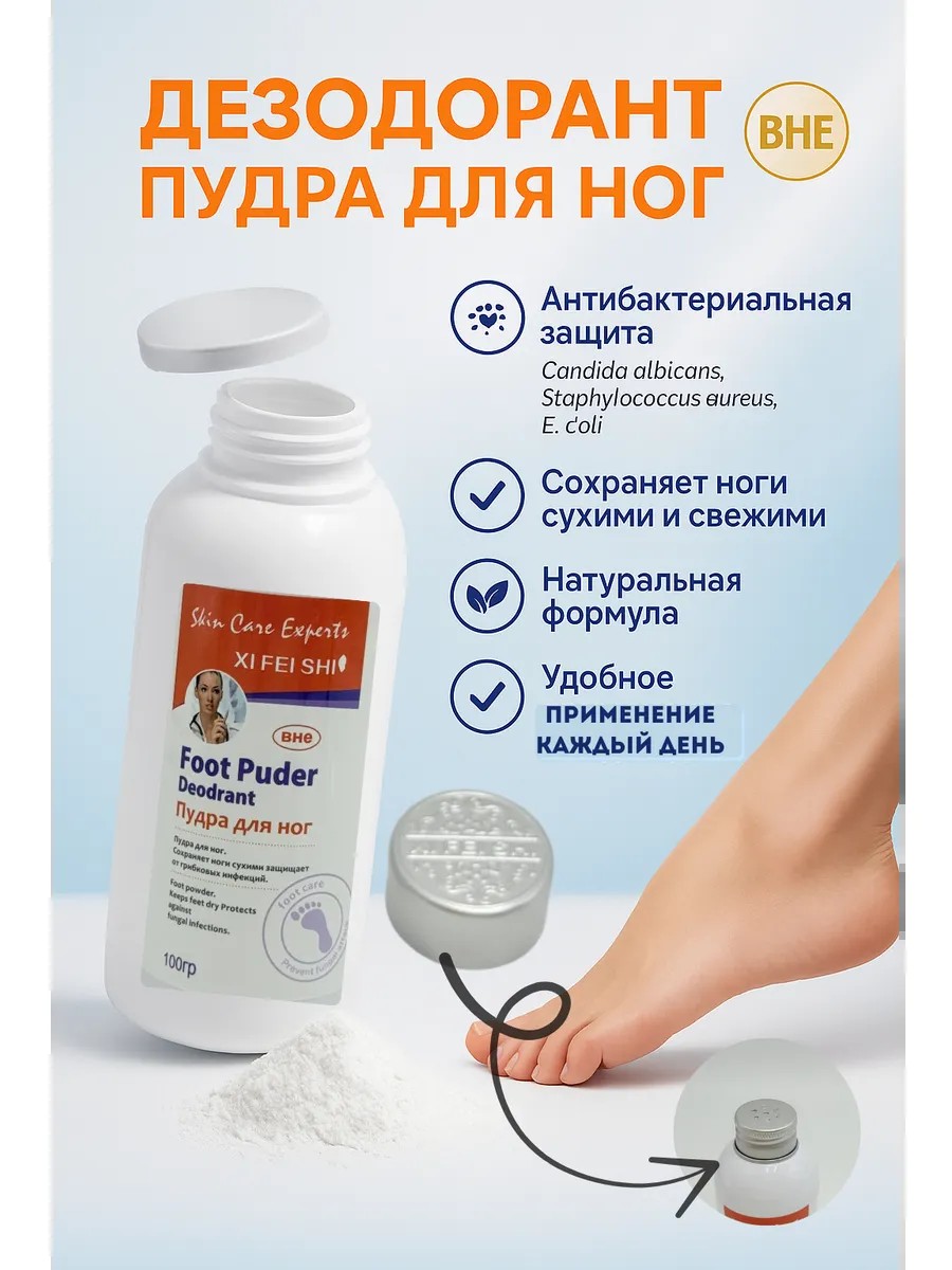 | Полное наименование товара | Дезодорант-пудра для ног 100 г с антибактериальным эффектом, защита от грибка и неприятного запаха |