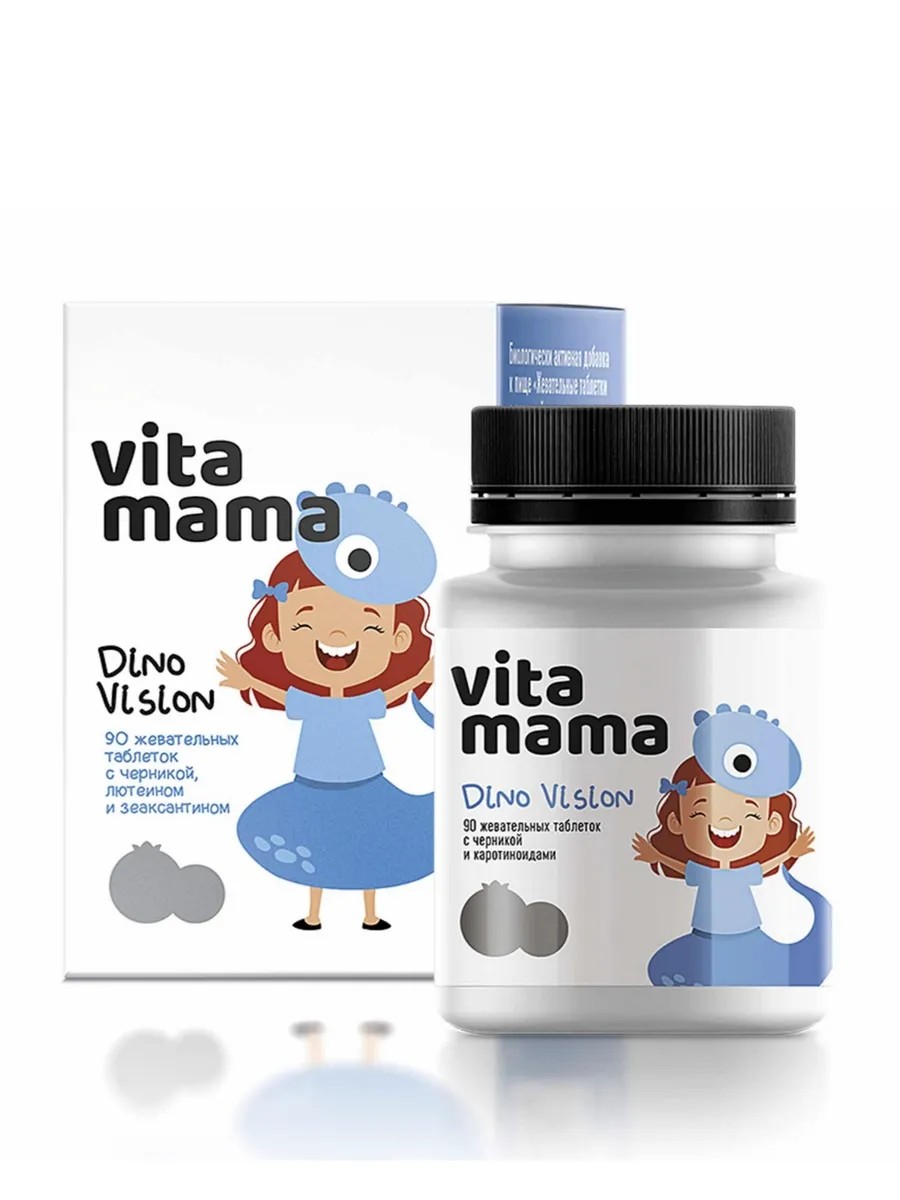 Dino Vision Vitamama — это жевательные таблетки с черникой для детей от 3 лет и взрослых, поддерживающие зрение. В составе: экстракт черники, лютеин, зеаксантин и витамин С — всё для защиты глаз от ультрафиолета, снижения усталости и поддержки остроты зрения. Принимать по 3 таблетки в день во время еды, курс — 1–2 месяца, вкус приятный, сахара почти нет .