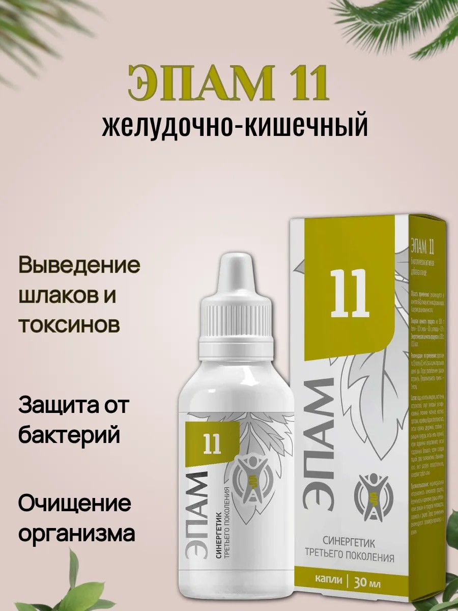 Натуральная помощь для желудка и кишечника.ЭПАМ 11 — источник активных веществ, которые благотворно влияют на работу пищеварительной системы и оказывают общеукрепляющее действие. Именно от работы желудочно-кишечного тракта зависит то, как выглядим и чувствуем себя. Натуральные компоненты ЭПАМ 11 способствуют очищению организма, выведению шлаков и токсинов. Благодаря этим свойствам ЭПАМ 11 включают в детокс-диеты и программы по снижению веса.1. **Базовый комплекс.** Сбой в работе желудочно-кишечной системы приводит к тому, что из организма не выводятся шлаки и токсины, снижается работоспособность и падает иммунитет. Пчелиное маточное молочко и прополис оказывают общеукрепляющую поддержку и тонизируют организм. Их активные вещества, деценовые кислоты, повышают иммунный статус и активируют защиту против вирусов и бактерий.2. **Направленный комплекс.** Экстракт сенны обладает мягкими слабительными и антитоксическими свойствами, благодаря чему обеспечивает очищение организма от шлаков и токсинов. Флавоноиды и глицирризиновая кислота повышают защиту органов пищеварительной системы от переедания способствуют заживлению слизистых оболочек при язвенной болезни и гастрите, обладают противовирусным и спазмолитическим действием.3. **Фоновый комплекс.** Активные вещества фонового комплекса способствуют заживление слизистой, помогая справиться с язвой и гастритом; оказывают мягкое мочегонное и слабительное действие, обеспечивая очищение организма; желчегонное, антимикробное, противовирусное и противовоспалительное действие.ПрименениеВзрослым по 10 капель (0,5 мл) 2 раза в день под язык во время еды. Перед употреблением флакон встряхнуть. Продолжительность приема ‑ 1 месяц. При необходимости прием повторить.Рекомендуется в качестве биологически активной добавки к пище, источника флавоноидов, содержащей деценовые кислоты.Противопоказания: индивидуальная непереносимость компонентов продукта, беременность и кормление грудью, аллергические реакции на продукты пчеловодства, склонность к диарее.