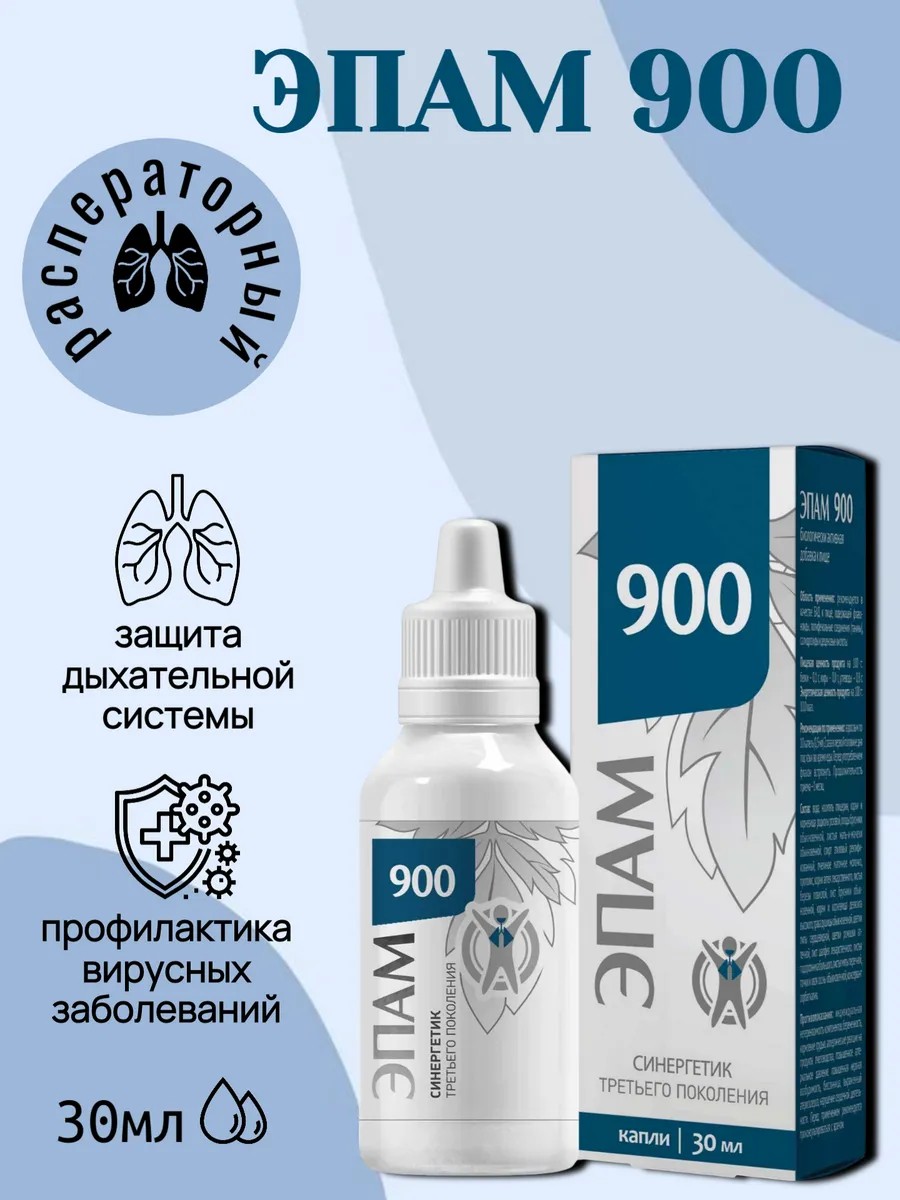 Защита дыхательной системы. ЭПАМ900 − источник активных веществ, которые способствуют защите дыхательной системы от вирусов и бактерий. В периоды роста респираторно-вирусных заболеваний и в условиях эпидемии дыхательные пути наиболее уязвимы, повышается риск проникновения вирусов и бактерий в организм через слизистые рта и носа. Обеспечить актуальную защиту и привести иммунитет в боеготовность помогут натуральные компоненты ЭПАМ 900.1. Базовый комплекс. Маточное молочко и прополис содержат деценовые кислоты, которые защищают клетки от проникновения вирусов, повышают иммунитет, характеризуются бактерицидными и противовоспалительными свойствами. Они оказывают организму естественную поддержку, не изнуряя иммунную систему, а приводя ее в тонус.2. Направленный комплекс. В состав вошли экстракты растений, которые традиционно включают в грудные сборы, они поддерживают бронхиальную систему и способствуют защите дыхательных путей. Мать-и-мачеха оказывает отхаркивающее и смягчающее действие, ее традиционно применяют при бронхитах, ларингитах и пневмонии. 3. Фоновый комплекс. Компоненты фонового комплекса поддерживают сопротивляемость организма инфекционным заболеваниям, способствуют нормализации обмена веществ. Применение: Взрослым по 10 капель (0,5 мл) 2 раза в первой половине дня под язык во время еды. Перед употреблением флакон встряхнуть. Продолжительность приема ‑ 1 месяц. При необходимости прием повторить.Рекомендуется в качестве биологически активной добавки к пище, содержащей флавоноиды, полифенольные соединения (танины), салидрозиды и деценовые кислоты. Противопоказания: индивидуальная непереносимость компонентов, беременность, кормление грудью, аллергические реакции на продукты пчеловодства, повышенное артериальное давление, повышенная нервная возбудимость, бессонница, выраженный атеросклероз, нарушение сердечной деятельности. (сибирское здоровье)