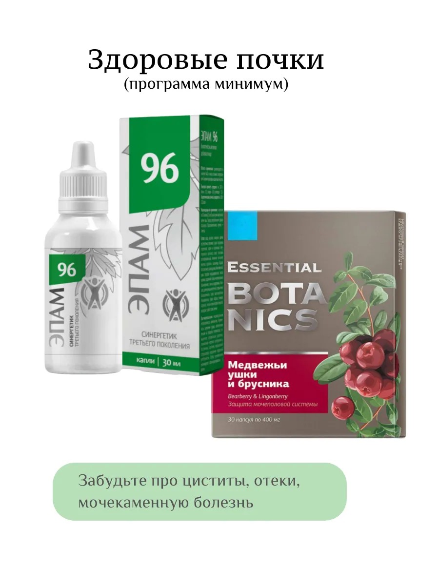Эпам96. Сбор натуральных компонентов обладают умеренным мочегонным, а также антибактериальным и противовоспалительным действием, благотворно влияют на работу почек и оказывают общеукрепляющую поддержку организму.