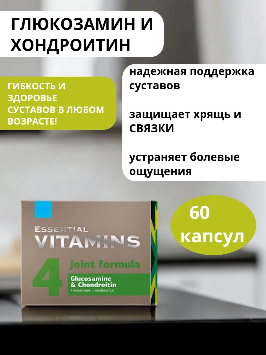 | Комплектация | Глюкозамин и хондроитин - Essential Vitamins 60 капсул; 1 картонная коробка |