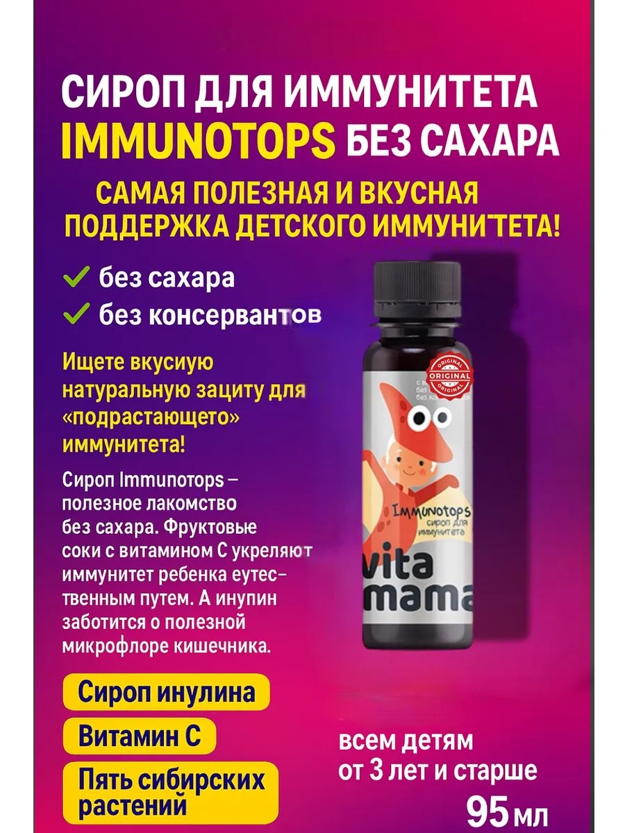 Ищете вкусную натуральную защиту для «подрастающего» иммунитета? Сироп Immunotops – полезное лакомство без сахара. Фруктовые соки с витамином С укрепляют иммунитет ребенка естественным путем. А инулин заботится о полезной микрофлоре кишечника.