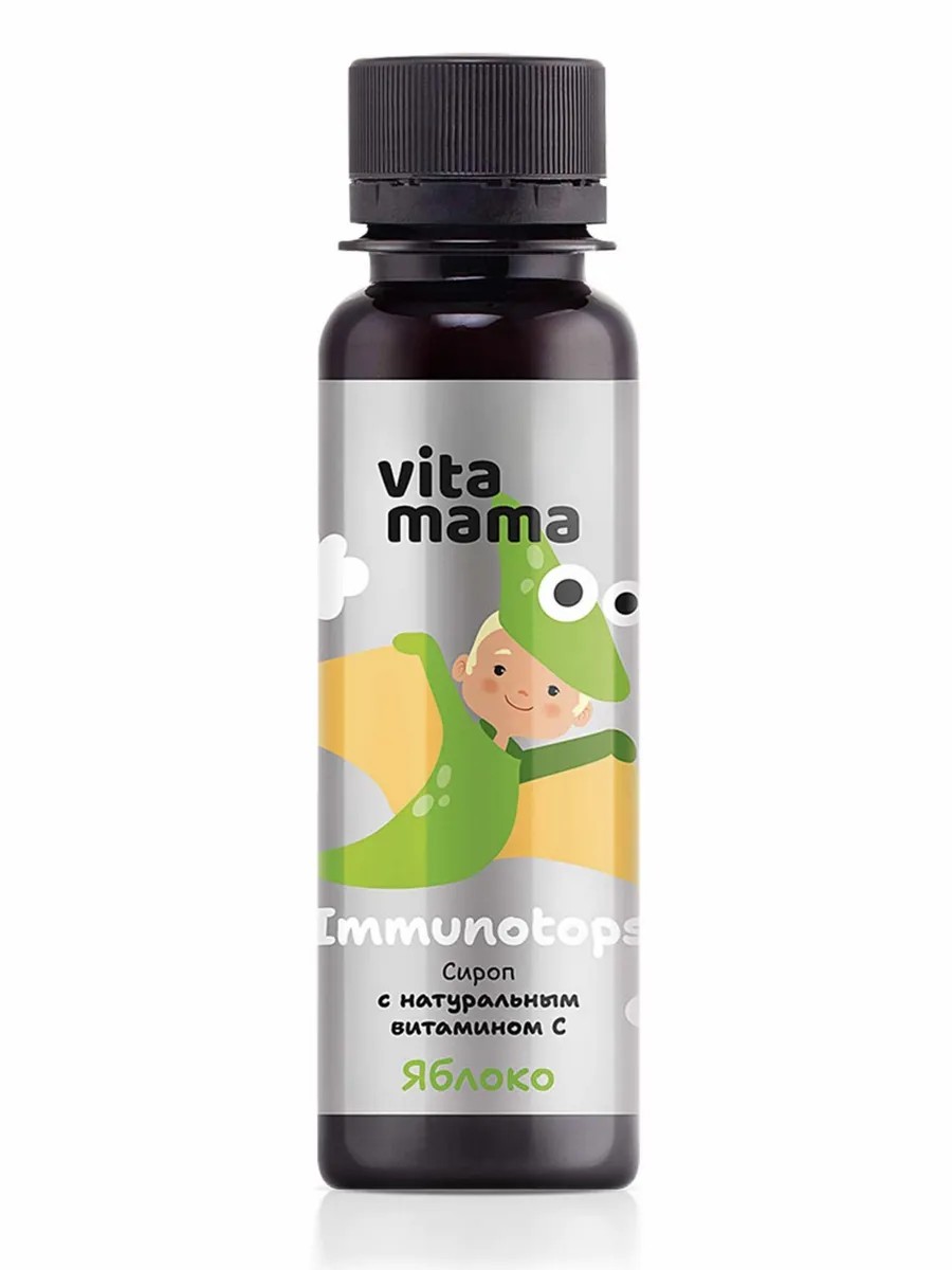 Immunotops сироп от Vitamama — это натуральное средство для поддержки иммунитета детей с витамином С и без сахара. В составе: яблочный и вишневый соки, инулин (пребиотик), экстракты ромашки, чабреца, шиповника, малины, подорожника, а также аскорбиновая кислота. Можно детям с 3 лет: по 1 чайной ложке 1-2 раза в день, разводить в воде или чае.