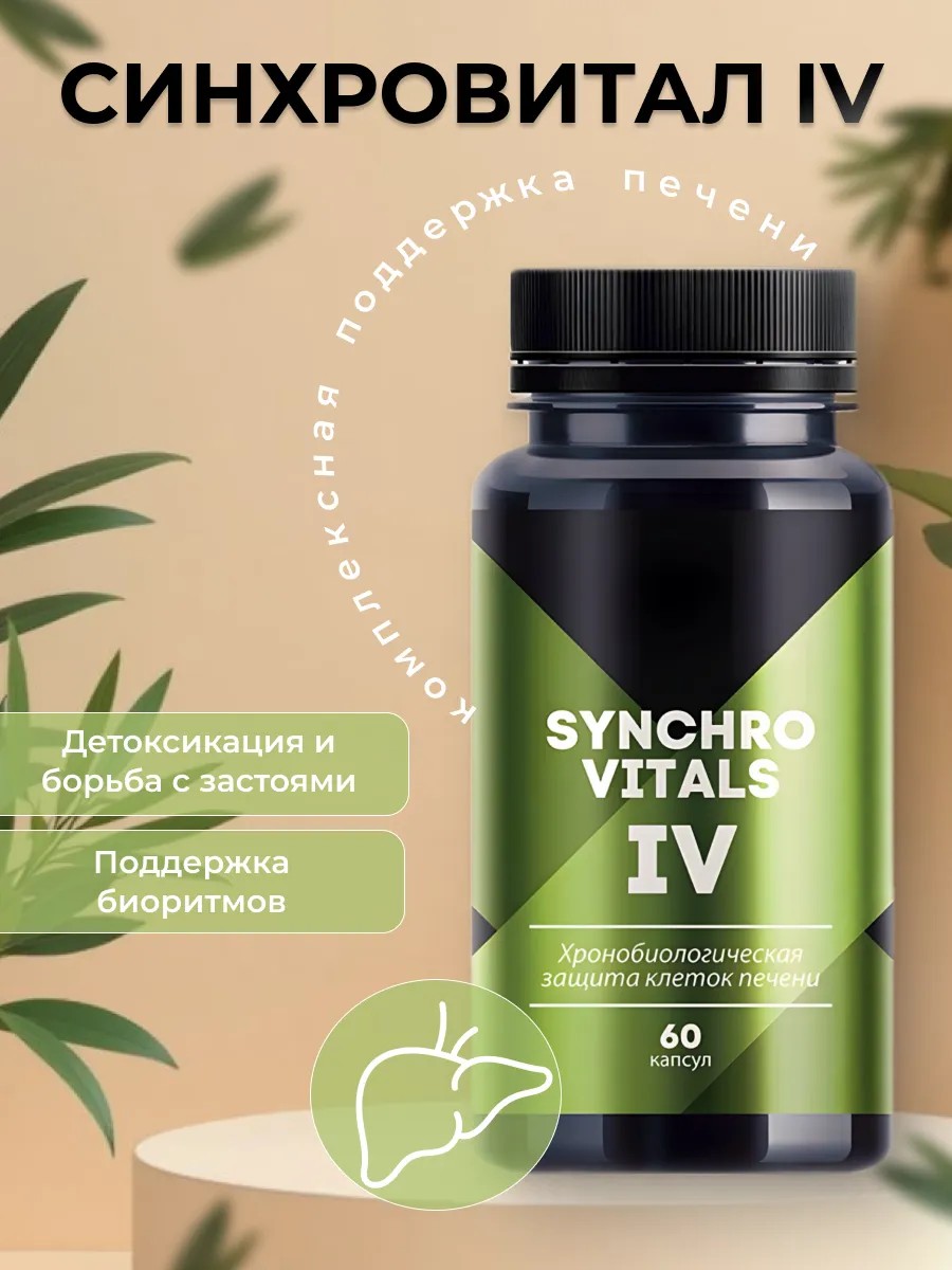 Synchrovital IV, a natural product for comprehensive liver health support, activates liver cell metabolism, promoting regeneration and enhancing protection against hepatitis C. Artichoke stimulates bile production and promotes liver and gallbladder cleansing. Baikal skullcap and St. John's wort have a mild choleretic effect and provide a general strengthening and tonic effect. Taurine improves bile flow and has antioxidant properties. Directions: Adults take 1 green capsule of Complex #1 in the morning and 1 transparent capsule of Complex #2 in the evening with meals.