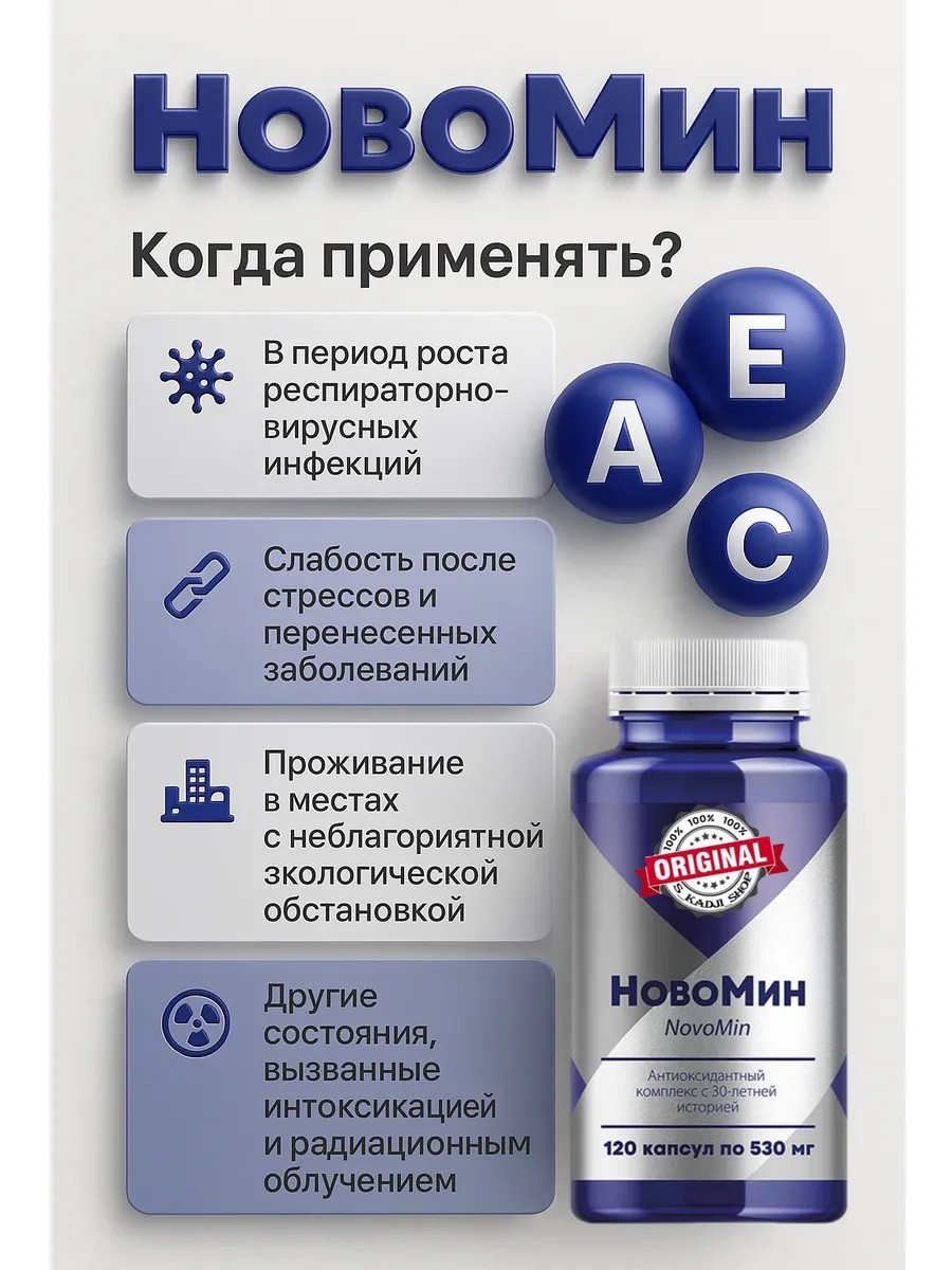 Легендарный продукт «НовоМин» основывается на уникальной идее: сочетании витаминов А, Е и С, способных увеличить антиоксидантную активность каждого из них в несколько раз.