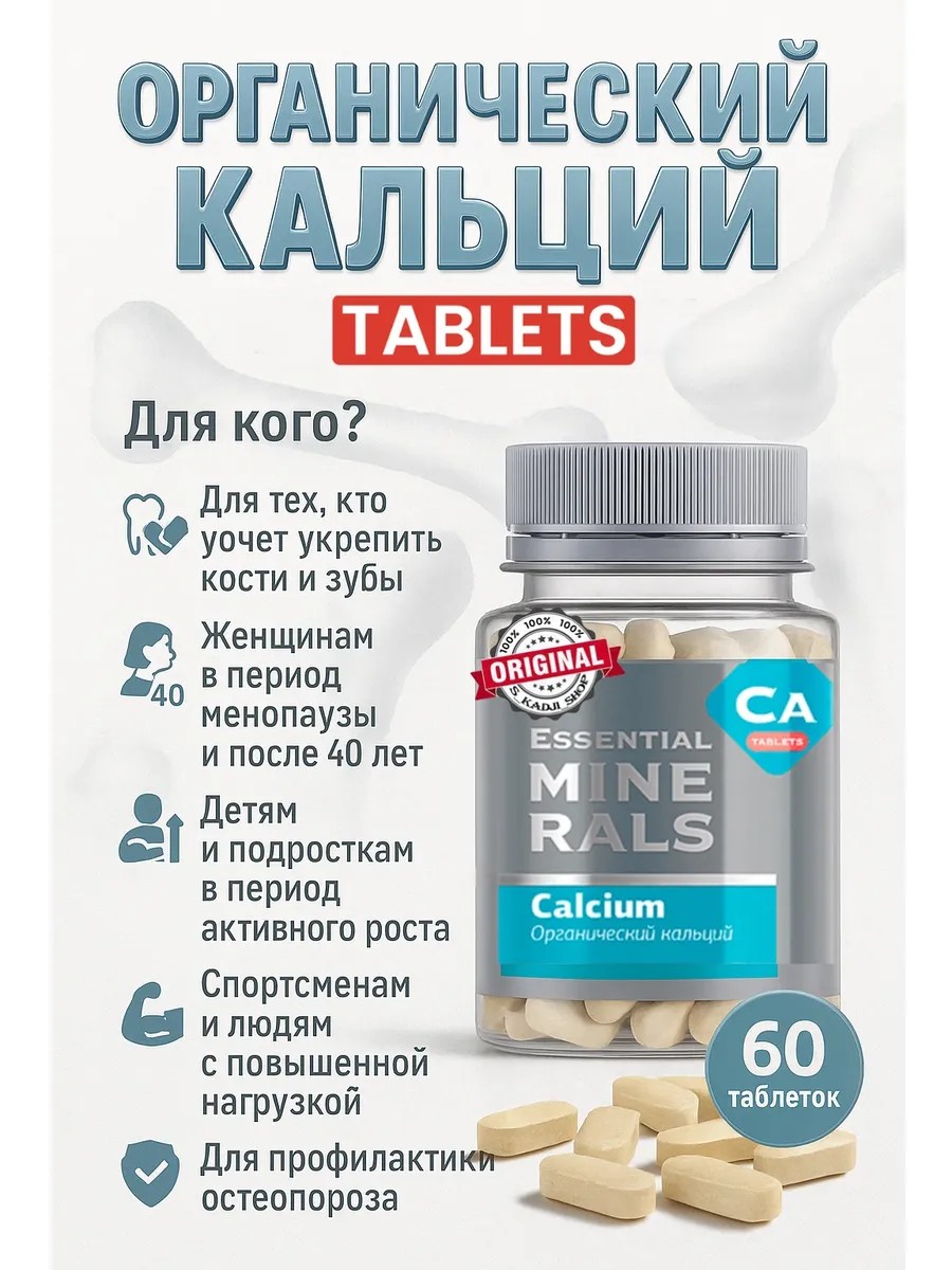 Более 99% кальция, содержащегося в организме человека, сосредоточено в костной ткани. Как главный структурный компонент опорно-двигательного аппарата, он должен поступать в организм в достаточных количества – не менее 1000 мг в сутки. Получить необходимую суточную дозировку только с продуктами питания сложно, поскольку в привычной неорганической форме он имеет низкую биодоступность и плохо усваивается организмом. В «Органическом кальции» этот макроэлемент представлен в нескольких органических формах (включая хелатную в виде бисглицината кальция), обладающих максимальной биодоступностью и оптимально усваивающихся организмом.Кальций необходим не только для укрепления костей, но и для правильной работы большинства систем организма. Он способствует нормализации тонуса кровеносных сосудов, отвечает за сокращение и расслабление скелетной мускулатуры, участвует в процессах регуляции возбуждения и торможения коры головного мозга.Обладая противовоспалительными, противоаллергическими и антиоксидантным свойствами, кальций играет важную роль в активации пищеварительных ферментов и регуляции свертываемости крови, способствует повышению сопротивляемости организма к воздействию инфекций и токсинов.