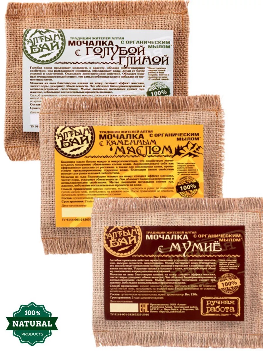 В набор входит 3 натуральные мочалки ручной работы с органическим мылом - Каменное масло , Мумиё, Голубая глина от компании АЛТЫН БАЙ, республика Алтай.