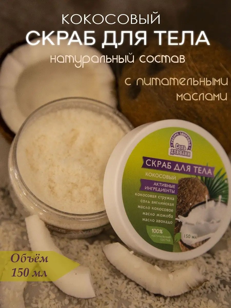 Скраб для тела Кокосовый с английской солью - натуральные косметические средства. Улучшают структуру кожи, очищают её от ороговевших клеток, делают её эластичной и бархатистой. Натуральные масла питают вашу кожу, придают ей упругость и молодость, английская соль насыщает ваш организм полезным магнием, который свободно проникает через кожные поры и прекрасно усваивается. Кокосовая стружка и тростниковый сахар являются естественными скрабирующими элементами, благодаря им кожа обновляется, приобретает молодость и красоту. После применения скраба не требуется увлажнять кожу баттерами и кремами, так как скраб-бальзам глубоко питает, увлажняет и наполняет кожу органическими маслами, обеспечивая гладкость кожи на 48 часов. Помогает избавиться от растяжек и целлюлита, способствует похудению и улучшению качества кожи. Женское косметическое средство для массажа в ванной, душе или бане способствует мягкому очищению кожи рук и ног. Массажный скраб подходит для всех типов кожи. Имеет приятный, нежный запах. Такое средство по уходу за телом отличный подарок на 8 марта, день рождения маме, сестре, подруге, любимой девушке или коллеге. Способ применения: массирующими движениями нанести скраб на влажную кожу, оставить средство на 2-3 минуты, затем смыть тёплой водой. Советуем использовать 2-3 раза в неделю. Рекомендуем всем, кто хочет иметь идеально нежную, гладкую и бархатную кожу. Будьте красивы и здоровы!