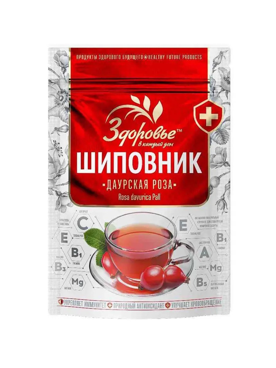 Здоровье Напиток сухой "Шиповник" 75 г натуральный. Шиповник содержит калий, натрий, кальций, магний, фосфор, железо, провитамин А, витамины С, В1, В2, РР. Он является поливитаминным, желчегонным, слабым мочегонным, понижающим кровяное давление средством, способствует выработке красных кровяных телец, укрепляет стенки кровеносной сосудистой системы, улучшает аппетит. Способствует увеличению выносливости, повышает сопротивляемость организма к инфекционным заболеваниям, интоксикациям, к воздействию неблагоприятных метеорологических факторов. Шиповник полезен для нормальной деятельности почек, печени, желудка и желудочно-кишечного тракта, активизирует обменные процессы в организме, улучшает память, стимулирует функцию половых желез, защищает от рака, простуды и гриппа, снимает головную боль. Является мощнейшим антиоксидантом, обладает превосходным вкусом и отлично утоляет жажду.