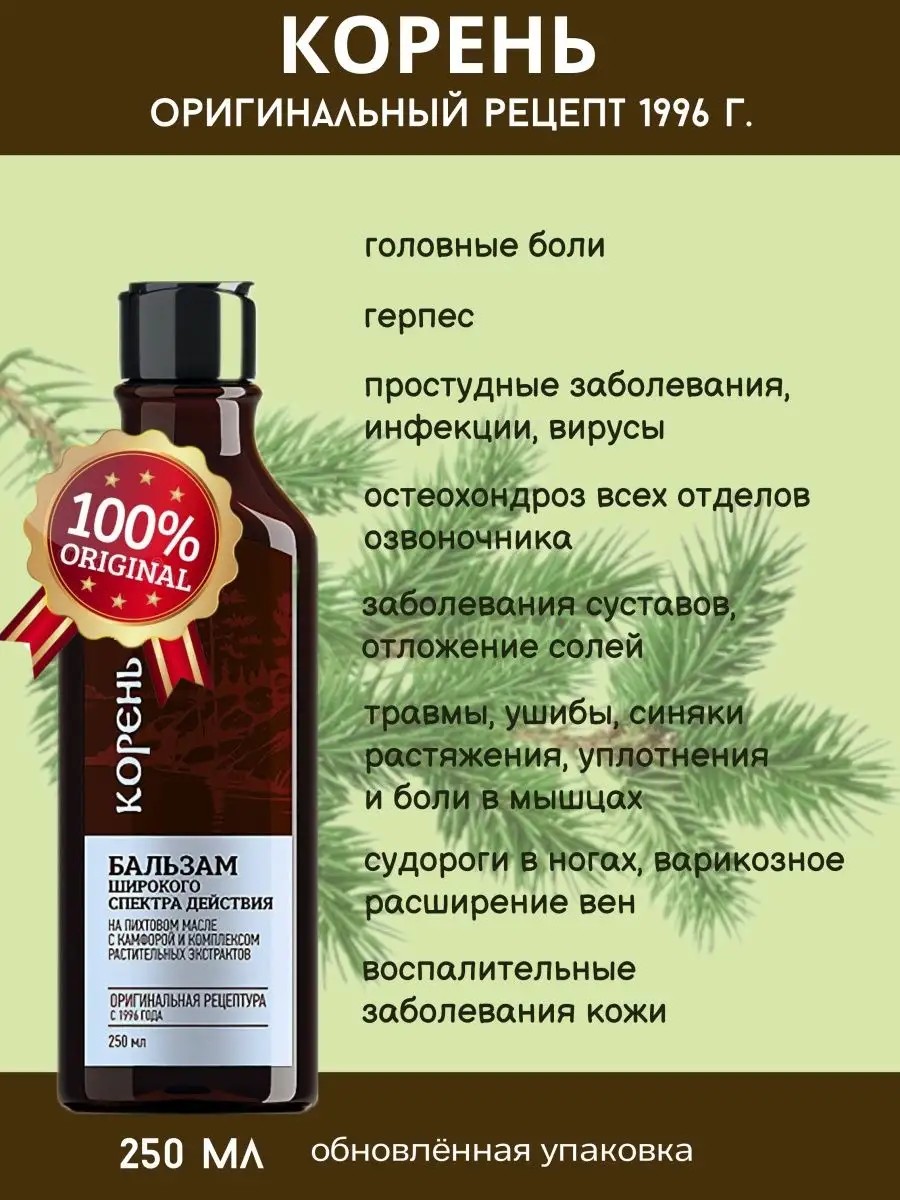 Бальзам Корень широкого спектра действия из сибири заботится о вашем здоровье! Применяется во время простуды для растирания ног, рук и грудной клетки, при ощущении дискомфорта в пояснице и шее, в случае упадка сил и скованности движений после физических нагрузок, при травмах, ссадинах и царапинах, при возрастном ограничении подвижности суставов, способствует снятию напряжения, обладает защитным и укрепляющим эффектом, активно прогревает, ускоряет восстановительные процессы, пробуждает ресурсы организма и восстанавливает силы. На 98,8% состоит из натуральных растительных продуктов.