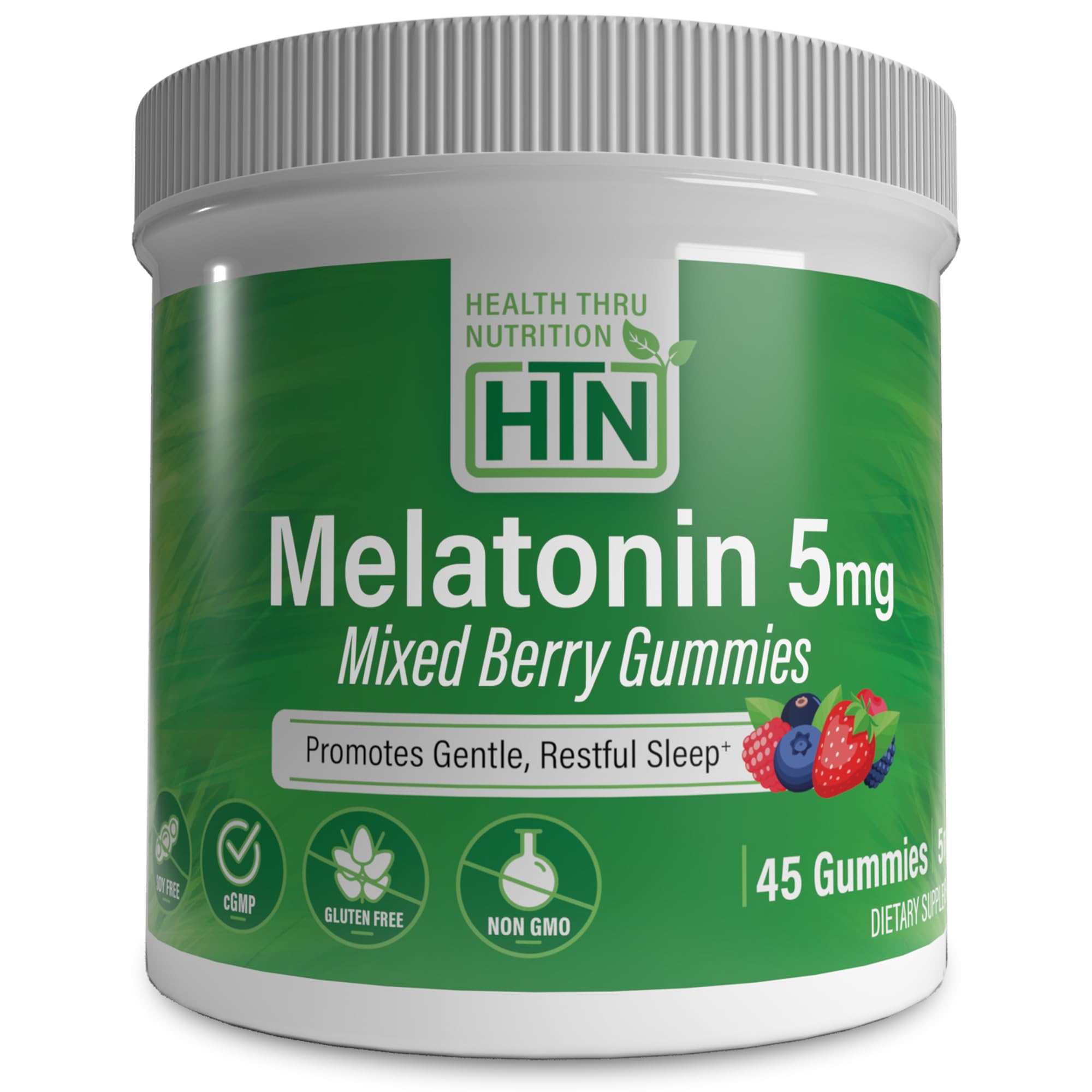 Health Thru Nutrition Melatonin 5mg Gummies | 45 Count Mixed Berry Flavor with Child-Resistant Cap | Gentle Restful Sleep Support Supplement | Non-GMO Gluten-Free Vegan-Friendly