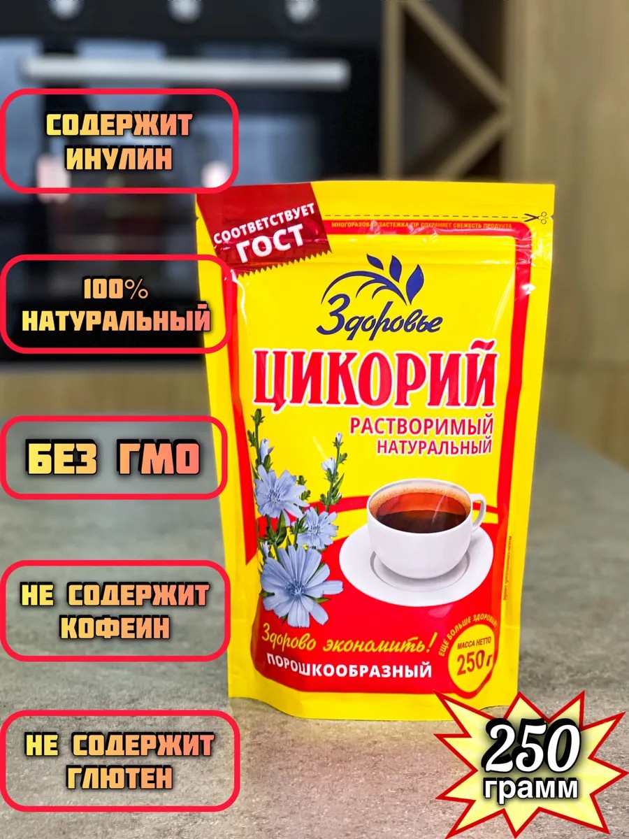 Ищете чем заменить утренний кофе? Цикорий Здоровье поможет вам взбодриться без вреда для организма. 100 % натуральный цикорий обладает насыщенным ореховым ароматом и ярким вкусом, напоминающим кофейный напиток. Растворимый цикорий не содержит кофеин и отлично подходит в качестве альтернативы кофе для беременных и кормящих мам. Благодаря высокому содержанию инулина способствует нормализации обмена веществ. Чашка цикория притупляет чувство голода, снижает аппетит и нормализует уровень сахара в крови. Цикорий - низкокалорийный продукт, за счет чего является идеальным для похудения. Порошкообразный цикорий подходит для приготовления горячих напитков с молоком и сливками, можно добавить мёд, сахар, лимон или корицу по вкусу.