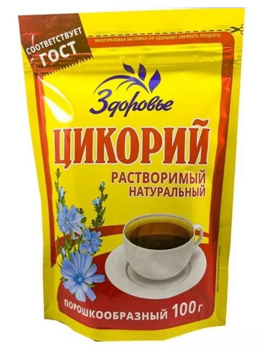 Health Chicory Instant Natural 100g. Health Chicory will help you invigorate without harming your body. 100% natural chicory has a rich nutty aroma and a vibrant flavor reminiscent of coffee. Instant chicory is caffeine-free and is an excellent alternative to coffee for pregnant and nursing mothers. Thanks to its high inulin content, it helps normalize metabolism. A cup of chicory dulls hunger, reduces appetite, and normalizes blood sugar levels. Chicory is low in calories, making it ideal for weight loss. Powdered chicory is suitable for making hot drinks with milk and cream; you can add honey, sugar, lemon, or cinnamon to taste. Indulge in your favorite Americano, cappuccino, or latte; simply replace the coffee with chicory. You can buy roasted chicory powder "Health" in a bag from our brand "Around the World."