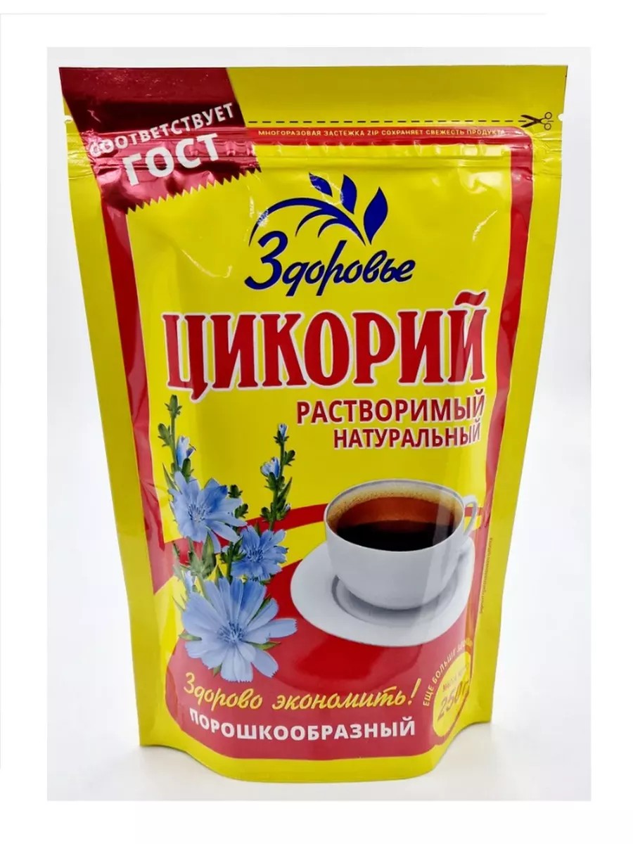 Цикорий "Здоровье":- Не содержит ГМО, добавок и искусственных добавок;- Производится в России;- Можно употреблять в пост и для вегетарианцев;- Без добавления сахара, консервантов и красителей.:- Растворимый порошкообразный цикорий;- 250 грамм в упаковке;- 12 пачек в коробе;- Упаковка дой-пак.Преимущества товара:- Цикорий богат витаминами и микроэлементами;- Содержит инулин - пребиотик, который улучшает микрофлору кишечника;- Улучшает пищеварение и обмен веществ;- Снижает уровень холестерина и сахара в крови;- Обладает антиоксидантными свойствами;- Подходит для людей с непереносимостью кофеина.Польза для пользователя:- Насыщенный вкус и аромат;- Удобная упаковка для хранения;- Компактный размер позволяет брать цикорий с собой в дорогу;- Безопасный и натуральный продукт без добавления вредных веществ.