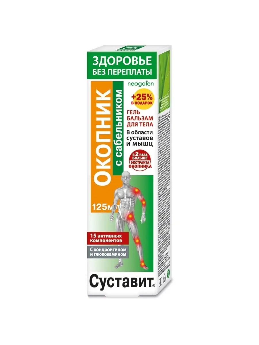 Суставит. Окопник с сабельником" Neogalen (Неогален) серии "Здоровье без переплаты" -эффективное средство на основе природных компонентов. Способствует нормализации функционального состояния опорно-двигательного аппарата. Обеспечивает структурными элементами для активного обновления и гибкости. Стимулирует естественную регенерацию тканей, препятствует развитию деструктивных процессов и старению. Действие и эффективность геля бальзама для тела обеспечены высокой биологической активностью его натуральных компонентов, обладающих выраженным положительным комплексным действием.