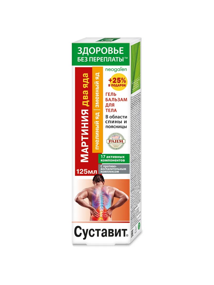Гель-бальзам Мартиния два яда (пчелиный яд/змеиный яд) - эффективное средство на основе природных компонентов. Способствует нормализации функционального состояния. Стимулирует естественную регенерацию тканей, препятствует развитию деструктивных процессов. Выраженные противовоспалительные свойства Мартинии нашли применение в комплексной терапии воспалительных патологий опорно-двигательного аппарата: артритах, остеоартритах, бурситах, синовитах. Мартиния улучшает обменные процессы и двигательные функции суставов. Хондроитин и глюкозамин являются основными составляющими хрящевой ткани и естественными защитниками (хондропротекторами) клеток хряща. Совместное применение хондроитина и глюкозамина обеспечивает более высокое насыщение организма хондропротекторами по сравнению с действием одного компонента, а также более выраженный эффект. Змеиный яд обладает высокой эффективностью при заболеваниях суставов с целью снятия боли и воспаления. Эффективность применения змеиного яда при радикулите, артрите, артрозе, остеохондрозе, и других патологиях суставов и позвоночника неоспорима и доказана многолетней практикой. Пчелиный яд является одним из наиболее сильнодействующих средств при лечении заболеваний суставов и позвоночника. Активизирует микроциркуляцию, тормозит развитие дегенеративных процессов в суставах и позвоночнике, способствует выведению продуктов распада и глубокому проникновению лечебных компонентов в проблемную область. Крем от боли в суставах с экстрактами и маслами лекарственных растений обеспечивают суставы питательными веществами, улучшают кровоснабжение и обмен веществ в околосуставных тканях, стимулируют восстановительные процессы в хряще.