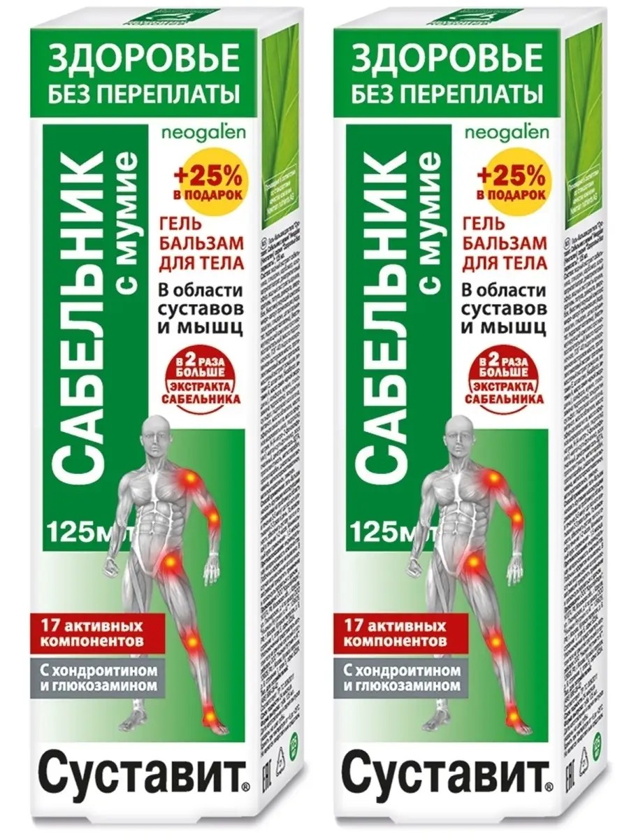 Суставит. Сабельник с мумие" Neogalen (Неогален)серии "Здоровье без переплаты"- эффективное средство на основе природных компонентов. Способствует нормализации функционального состояния опорно-двигательного аппарата. Обеспечивает структурными элементами для активного обновления и гибкости. Стимулирует естественную регенерацию тканей, препятствует развитию деструктивных процессов и старению. Действие и эффективность геля бальзама обеспечены высокой биологической активностью его натуральных компонентов, обладающих выраженным положительным комплексным действием.