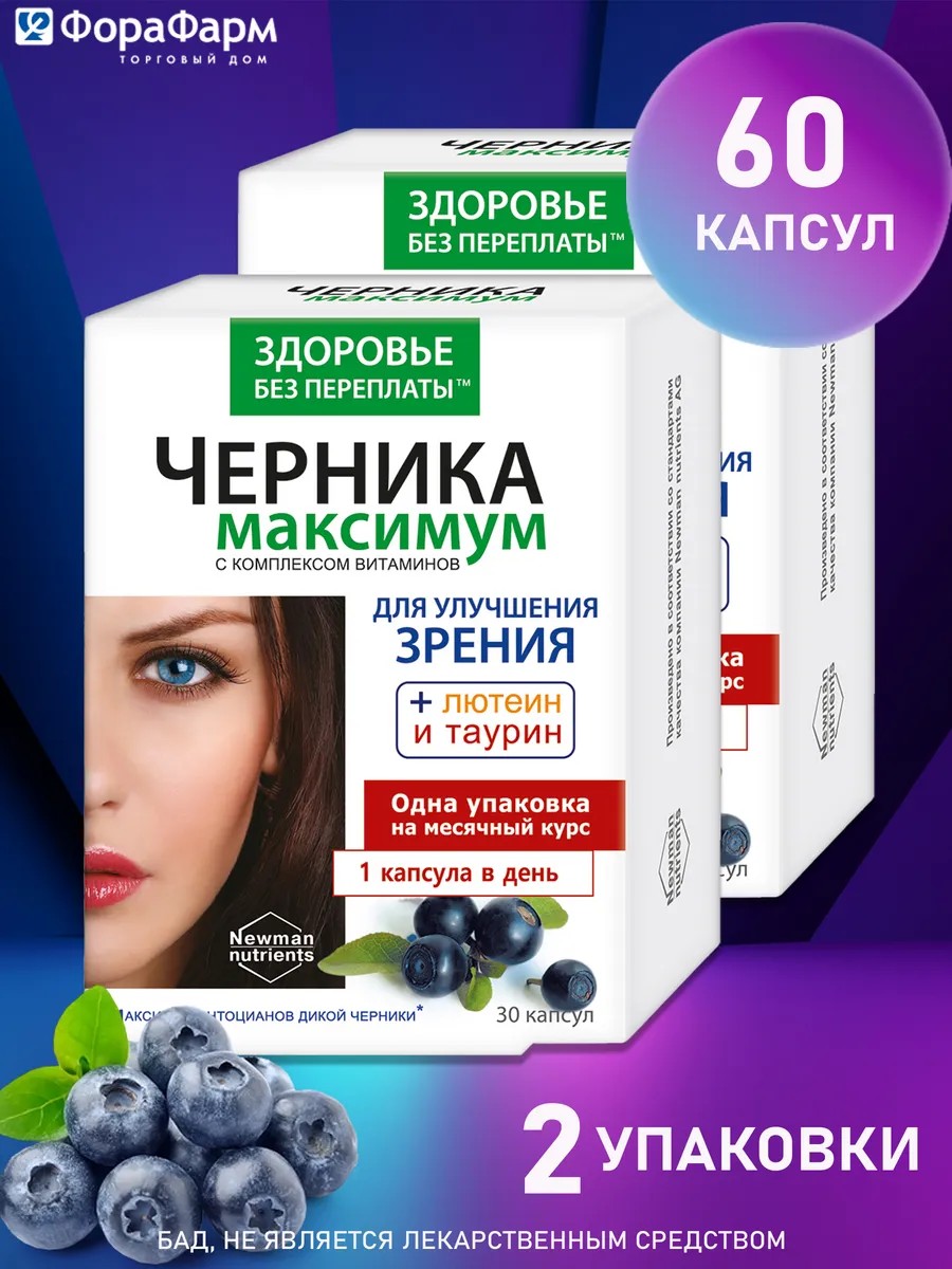Blueberry Maximum capsules with a vitamin complex, lutein, and taurine are a next-generation complex. They are used to improve eye function and reduce the risk of vision loss due to increased visual stress (prolonged computer work, poor lighting, prolonged reading or television viewing, driving, especially at night), decreased visual acuity (including age-related), and eye fatigue. The action and effectiveness of Blueberry Maximum capsules with a vitamin complex are determined by the properties of their biologically active substances, which are necessary for normal metabolic processes and the functioning of the visual system. Blueberries are a rich source of anthocyanins, the most powerful of all natural antioxidants. Blueberry anthocyanins improve the sensitivity of the retina to changes in light intensity, enhance visual acuity in low light, improve twilight vision, reduce eye fatigue from prolonged work, and have an anti-sclerotic effect. Bilberry extract increases levels of the neurotransmitter dopamine, which improves the transmission of nerve impulses along the optic nerve. Lutein is a carotenoid found in the retinal pigment layer. It has a shielding and antioxidant effect, protecting the retina, and especially its central part – the macula – from the damaging effects of light rays and oxidative stress. Taurine improves energy and metabolic processes in ocular tissues and influences the synthesis of retinol (vitamin A). Zinc is a key participant in biochemical reactions that ensure the vital activity and function of the retina. Vitamin C is a natural antioxidant, the content of which in ocular tissue is tens of times higher than in blood plasma. The composition of capsules with a vitamin complex has a comprehensive effect on the visual apparatus, providing the eyes with nutrients. It reduces the negative impact of high visual stress. Contraindications: individual intolerance to the components, pregnancy, breastfeeding. It is recommended to consult a doctor before use. It is not a medicinal product.