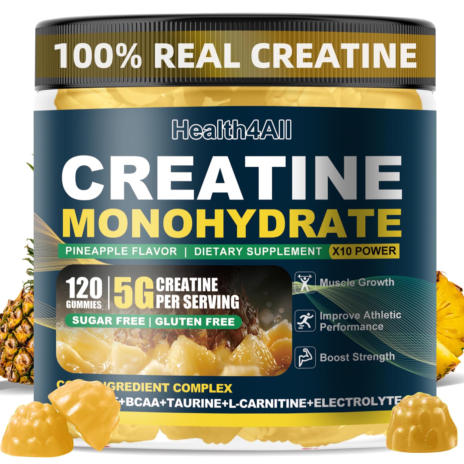 Health4All Creatine Monohydrate Gummies 5G for Men & Women Preworkout Supplement for Energy & Muscle Growth Support with Electrolyte BCAA L-Carnitine & Taurine- Pineapple 120 Gummy