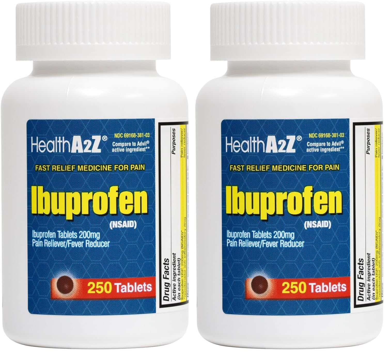 HealthA2Z Ibuprofen 200mg | Pain Relief | Body Aches | Headache | Arthritis | Cramps | Back Pain | Fever Reducer (250 Count) (Pack of 2)
