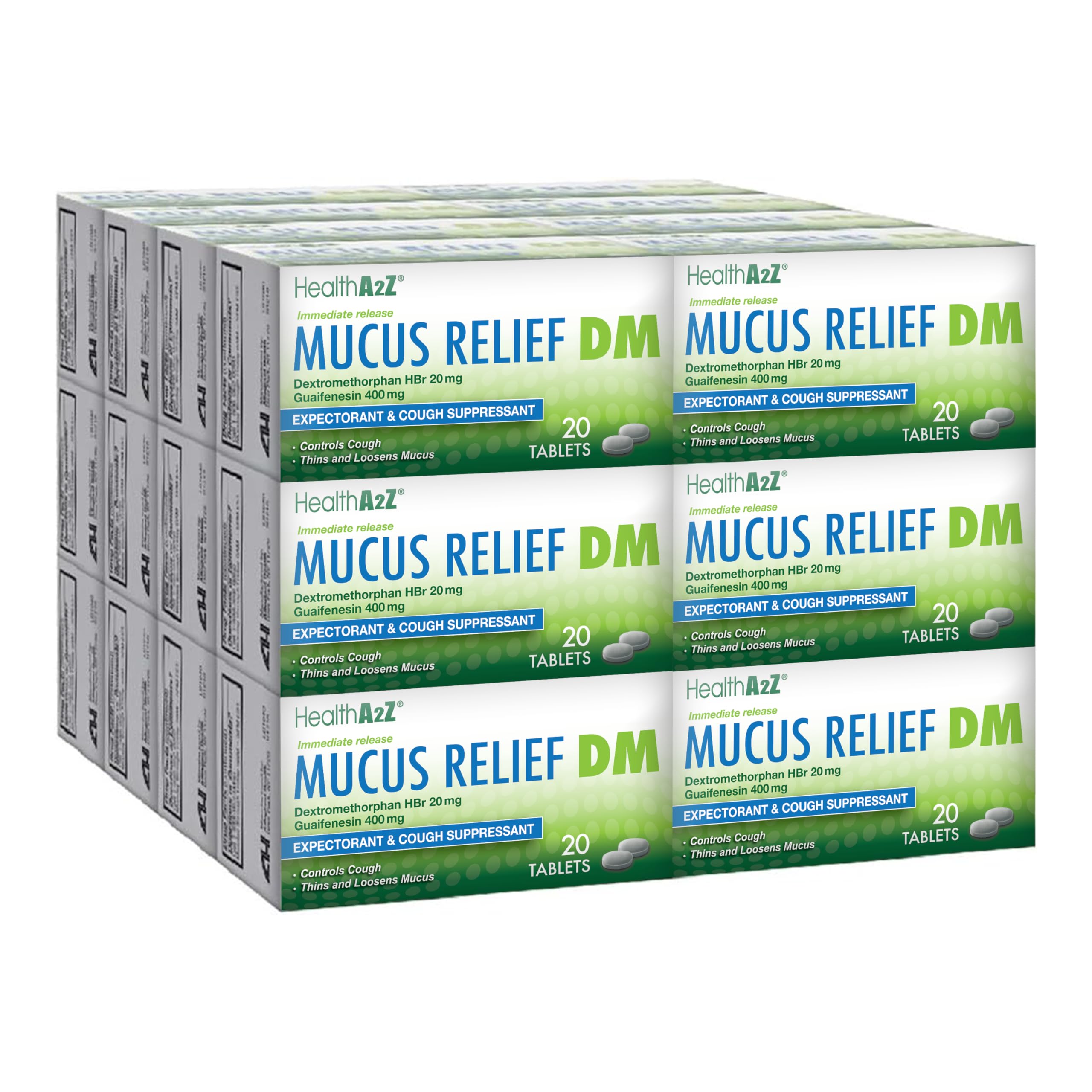 HealthA2Z Mucus Relief DM | Dextromethorphan HBr 20mg & Guaifenesin 400mg | Cough & Chest Congestion Relief | 24 Packs of 20 Caplets (480 Total) | Value Pack