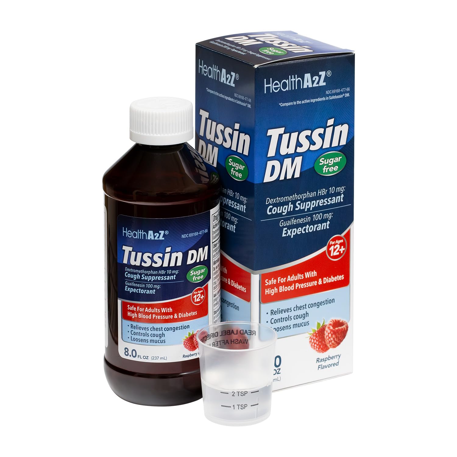 HealthA2Z Tussin DM Sugar Free | Dextromethorphan HBr 20mg Guaifenesin 200mg | Cough Suppressant & Expectorant | for Adults with High Blood Pressure & Diabetes | 8 FL Oz Raspberry Flavor