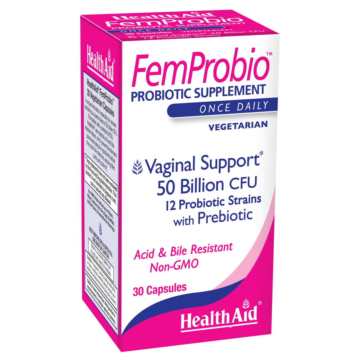 HealthAid FemProbio Once-Daily Probiotic with Prebiotic Fiber | 50 Billion CFU | 30 Vegetarian Capsules | Acid & Bile Resistant Lactose Gluten & GMO-Free