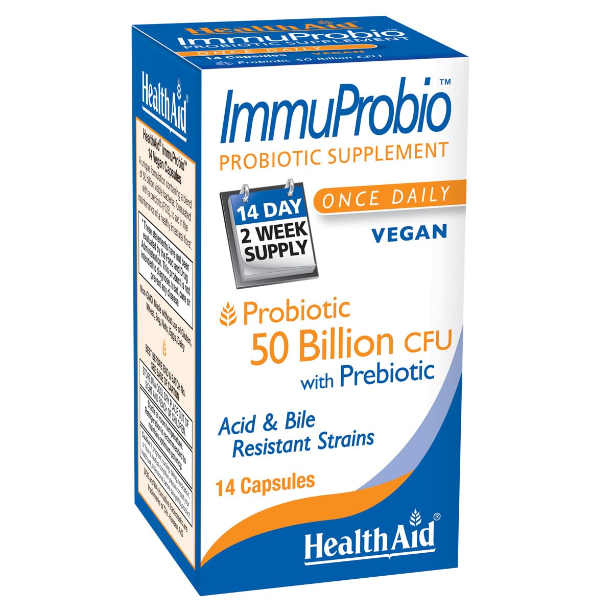 HealthAid ImmuProbio is a unique formulation containing a superior blend of 50 billion viable Probiotics with 10 strains, including the DDS-1 super strain, backed by 40 years of clinical research and fortified with a prebiotic (FOS), to aid in the maintence of healthy intestnial flora. HealthAid uses special acid bile resistant strains, which prevent the stomach juices destroying the ingredients before they reach the intestines, ensuring their purity and potency . Non GMO. Made without use of Gluten, Wheat, Soy, Nuts, Eggs Dairy
