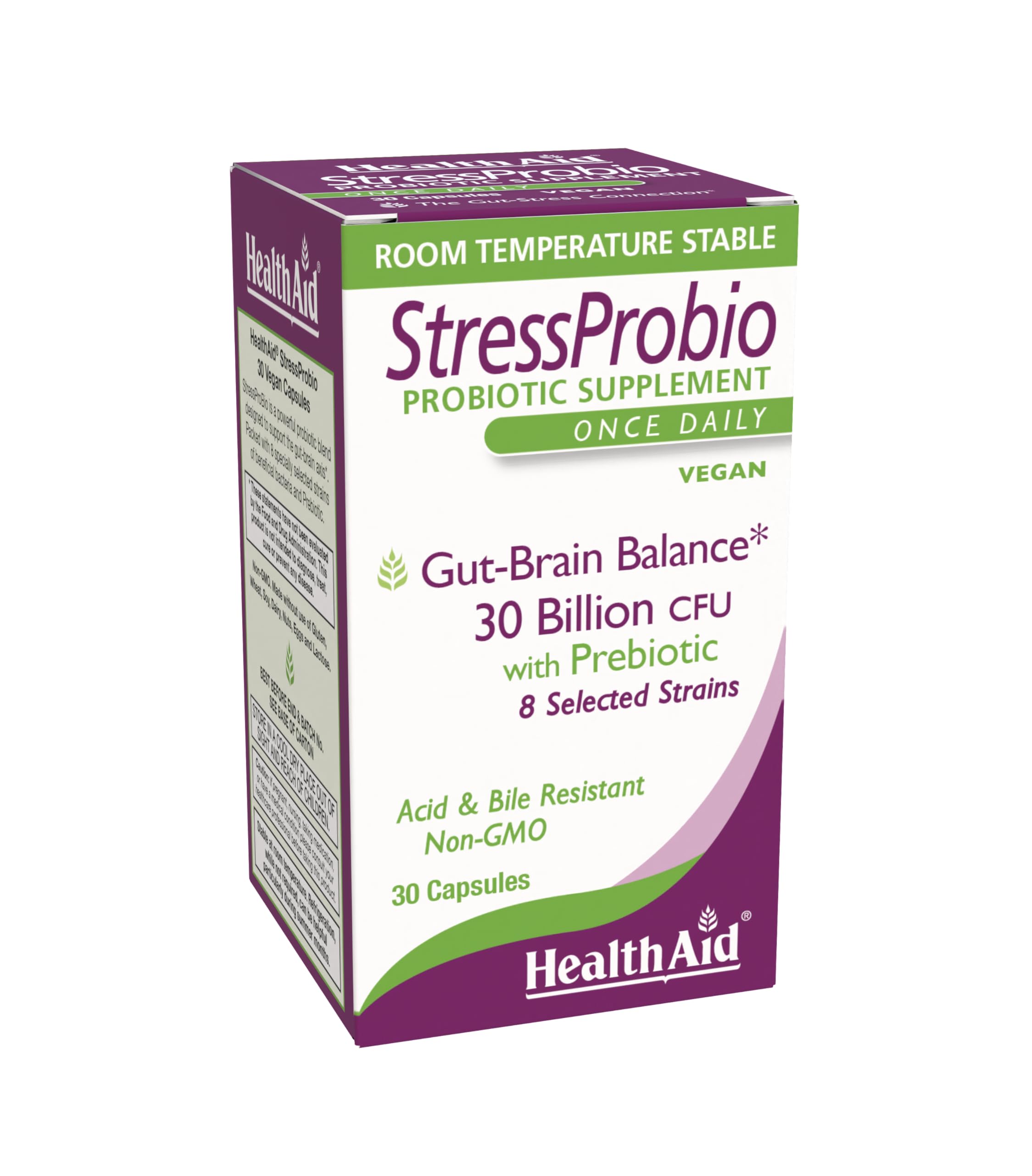 HealthAid StressProbio Gut-Brain Probiotic Supplement 30 Billion CFU 8 Vegan Strains + Prebiotic 30 Capsules Supports Gut Health & Emotional Well-Being*