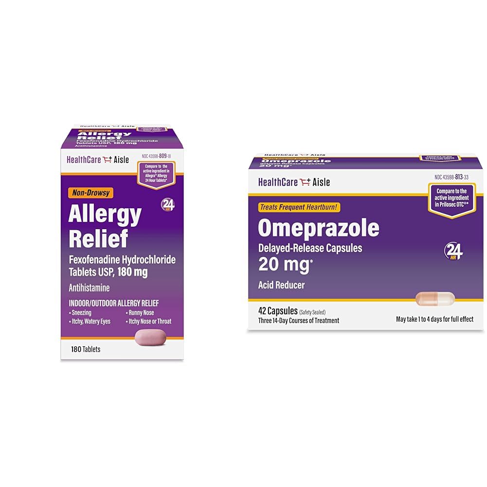 HealthCareAisle Allergy Relief - Fexofenadine Hydrochloride Tablets USP, 180 mg – 180 Tablets – Allergy Medication, Non-Drowsy 24-Hour Allergy Relief Do you suffer from indoor and outdoor allergies? Taken once a day, HealthCareAisle Allergy Relief Tablets (Fexofenadine Hydrochloride USP, 180 mg) temporarily relieve symptoms due to hay fever or other upper respiratory allergies such as runny nose sneezing itchy, watery eyes and itchy throat or nose. Each original prescription strength antihistamine tablet provides 24 hours of relief from indoor and outdoor allergies. This product is not manufactured or distributed by Chattem, Inc. (part of the Sanofi Group), distributor of Allegra Allergy 24 Hour Tablets. Allegra is a registered trademark of Aventisub LLC. HealthCareAisle Omeprazole 20 mg, 42 Delayed-Release Capsules - Acid Reducer, Treats Frequent Heartburn, 42 Count (Pack of 1) What are you doing about that frequent heartburn? Yes, HEARTBURN – that burning and painful feeling in your throat or chest caused by refluxed stomach acid. Proton Pump Inhibitors, like HealthCareAisle Omeprazole Delayed Release Capsules 20 mg, stop acid production at the source - the pumps that release acid into the stomach. With just one capsule a day, you can treat frequent heartburn that occurs two or more days a week. Tips for Managing Heartburn: Do not lie flat or bend over after eating. Do not wear tight-fitting clothing around the stomach. Do not eat before bedtime. Raise the head of your bed. Avoid heartburn-causing foods such as rich, spicy, fatty or fried foods, chocolate, caffeine, alcohol and certain fruits and vegetables. Eat slowly and avoid big meals. If overweight, lose weight. Quit smoking. This product is not manufactured or distributed by Procter Gamble, distributor of Prilosec OTC. Prilosec OTC is a registered trademark of AstraZeneca AB.